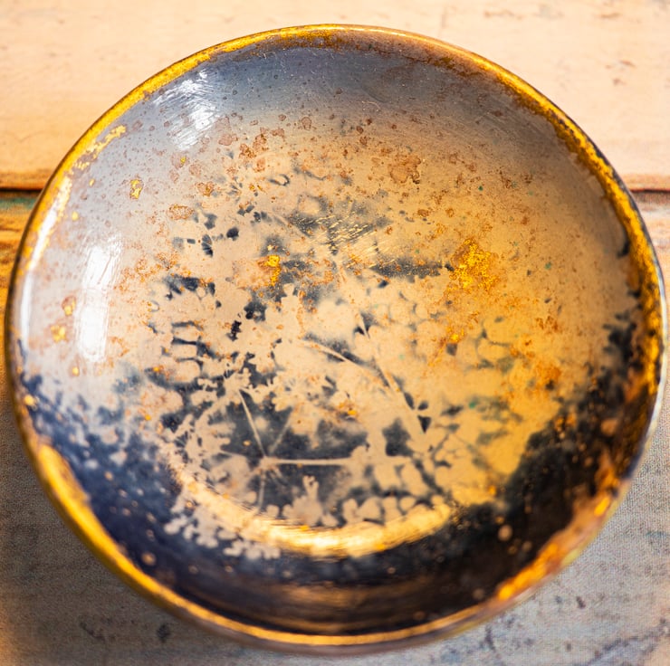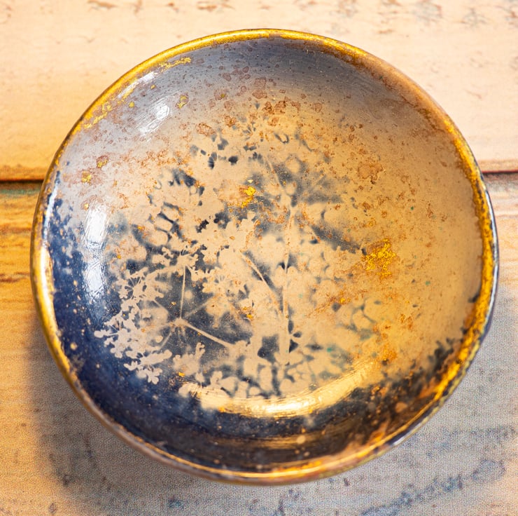 I used some sprinkles of sparkly gold ink and coarse sea salt in the wet cyanotype process. I also painted the rim with gold ink.
