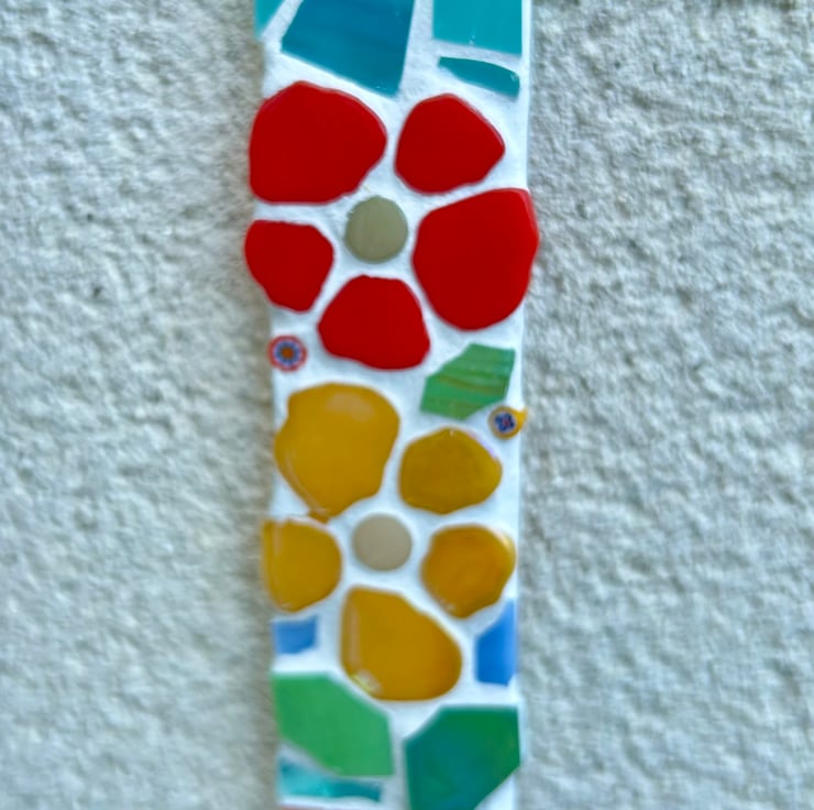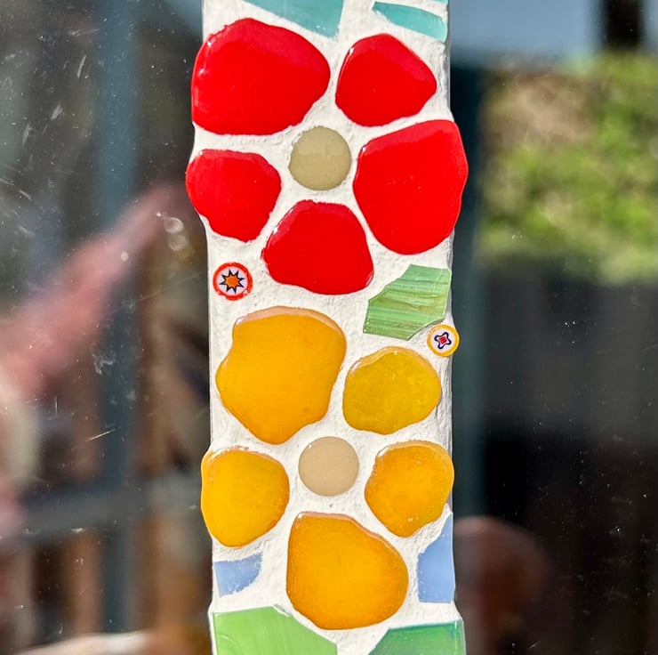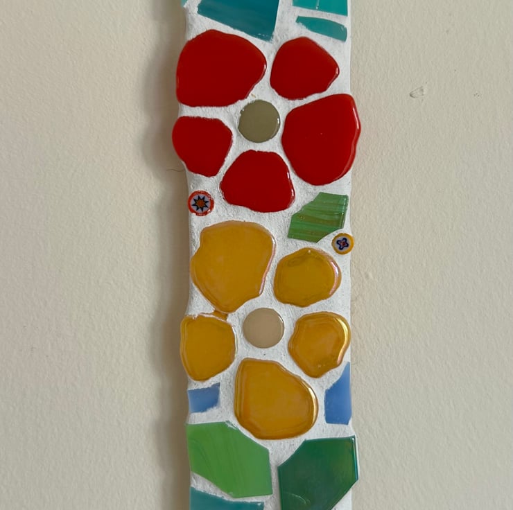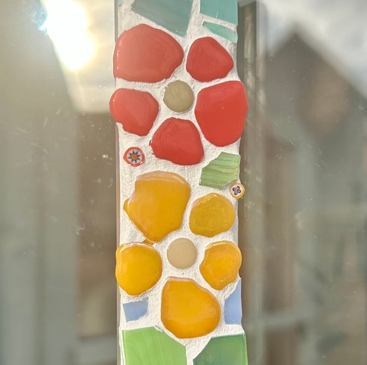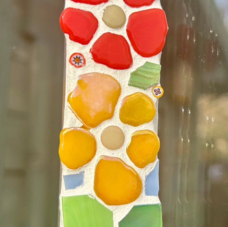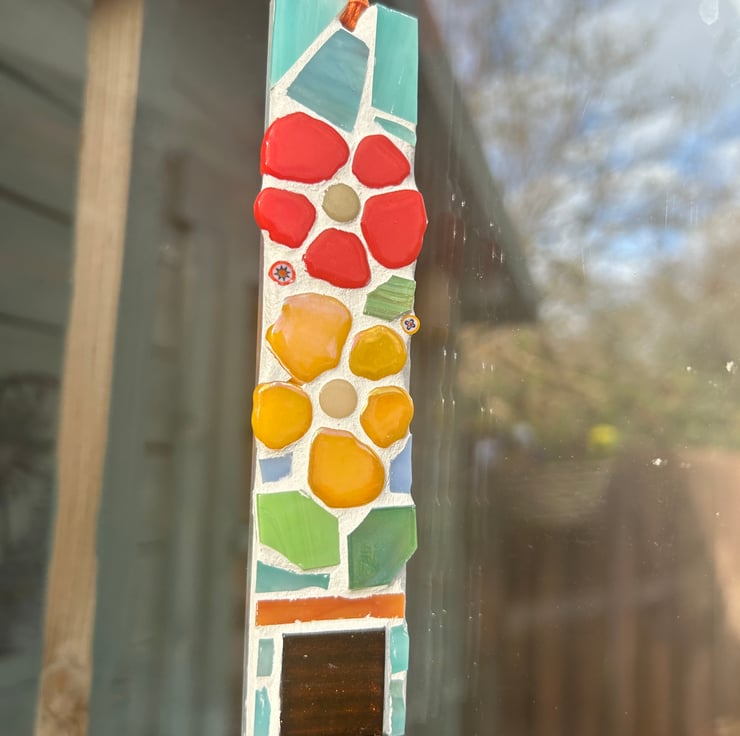 A small mosaic light catcher depicting summer flowers in hand cut ceramic and stained glass.