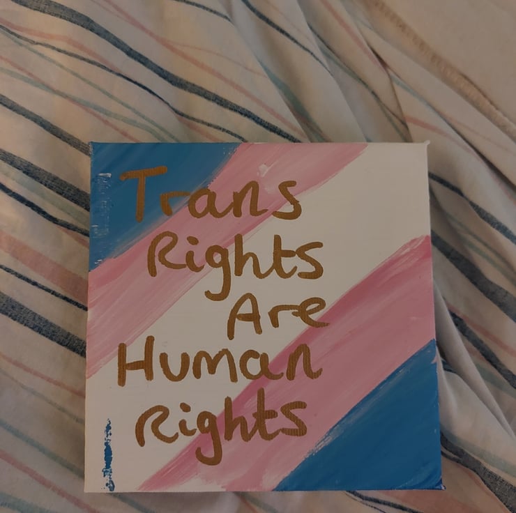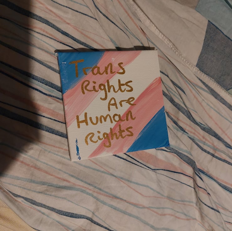 The transgender flag painted on a 4" squared canvas underneath the words "Trans rights are human rights"