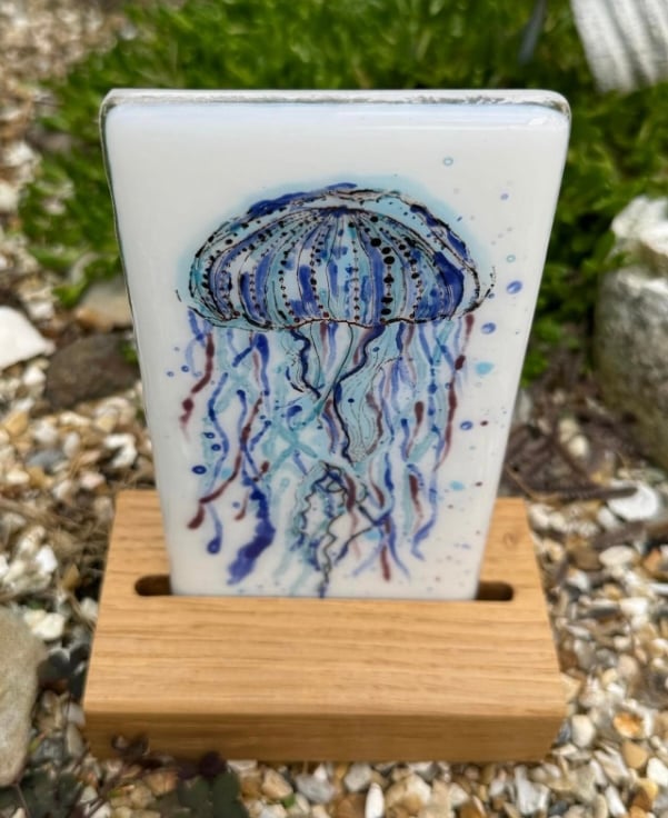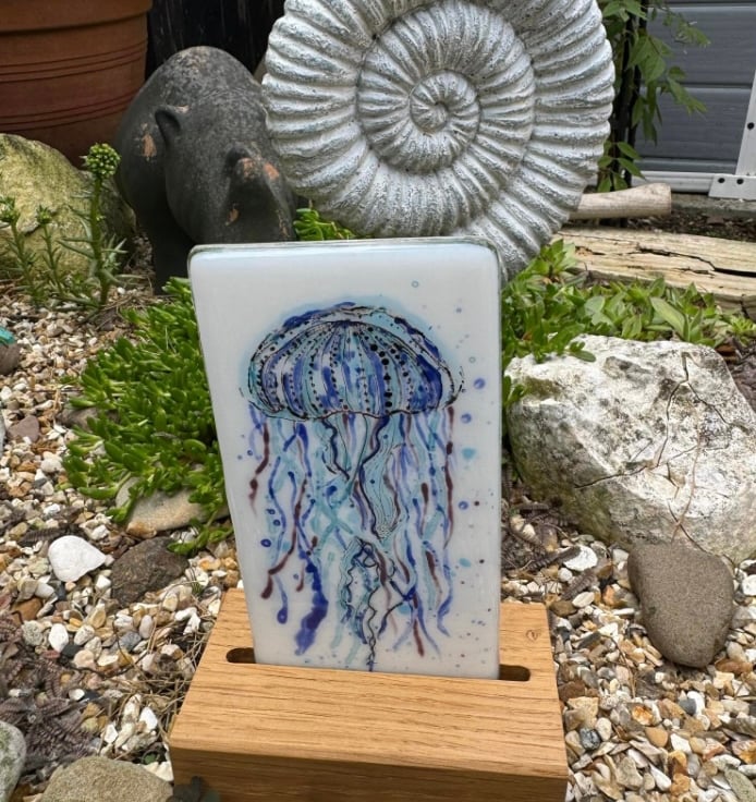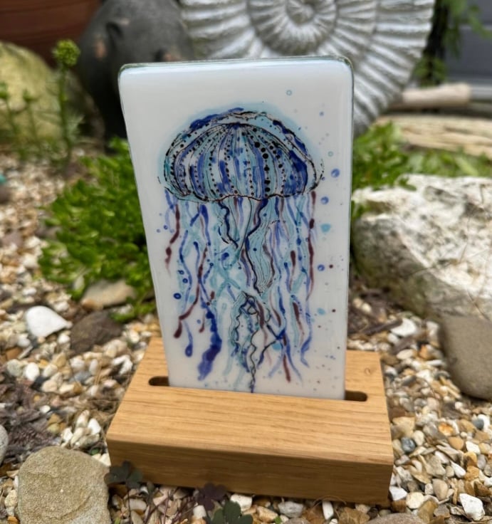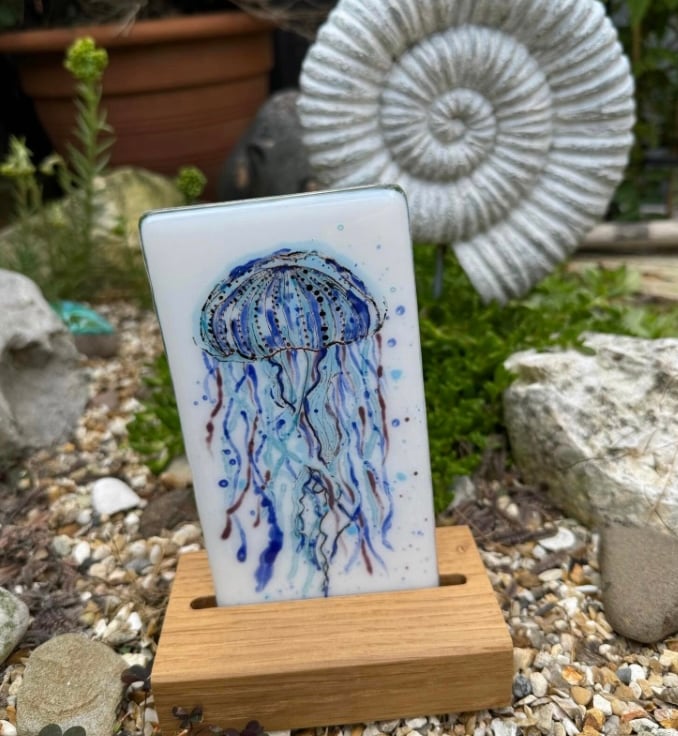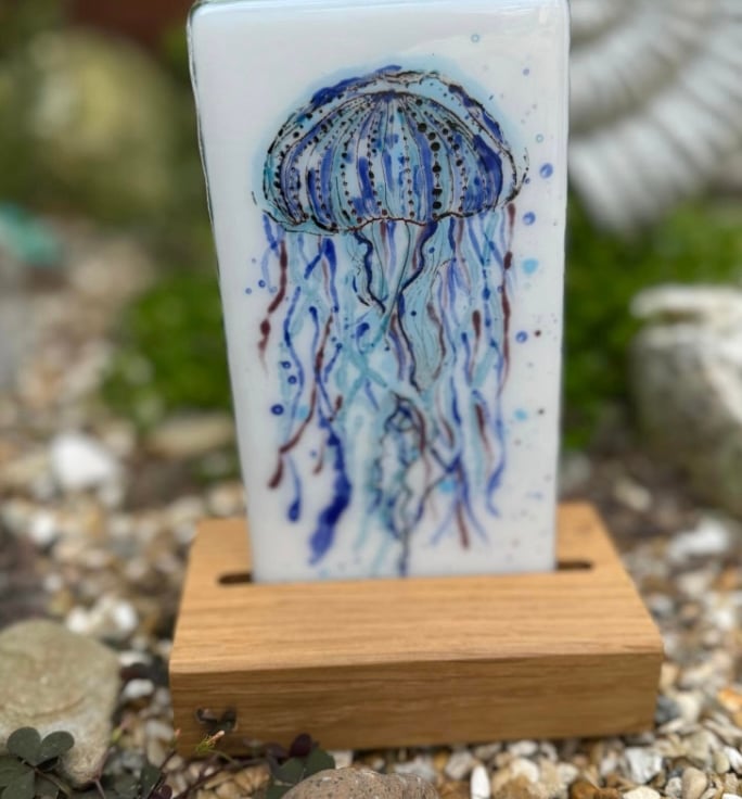 This is an unusual, gorgeous piece of fused glass art which I created here in Yorkshire. I used a decal design that I printed myself, then painted with enamels in different purple and blue colours to try and capture the translucency of these fantastic creatures. This would make the perfect gift for any marine life lover. It comes complete with its own solid oak stand and would look gorgeous on any windowsill, cabinet or table.