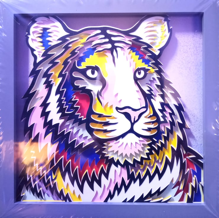 This beautifully multicoloured Tiger wall art, made from eco-friendly materials, communicates the wonder of this majestic animal. The thoughtful layering of high-quality cards gives it depth and a 3D effect.