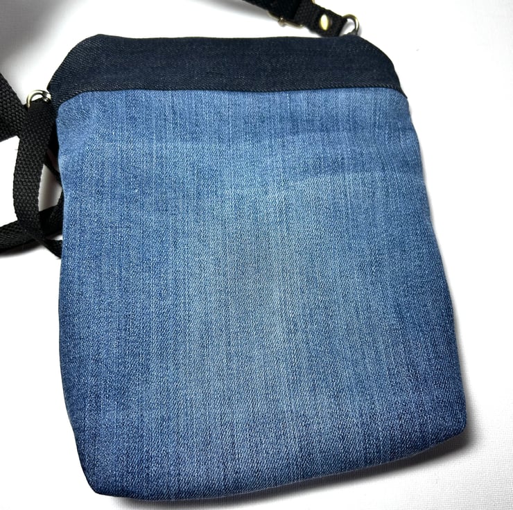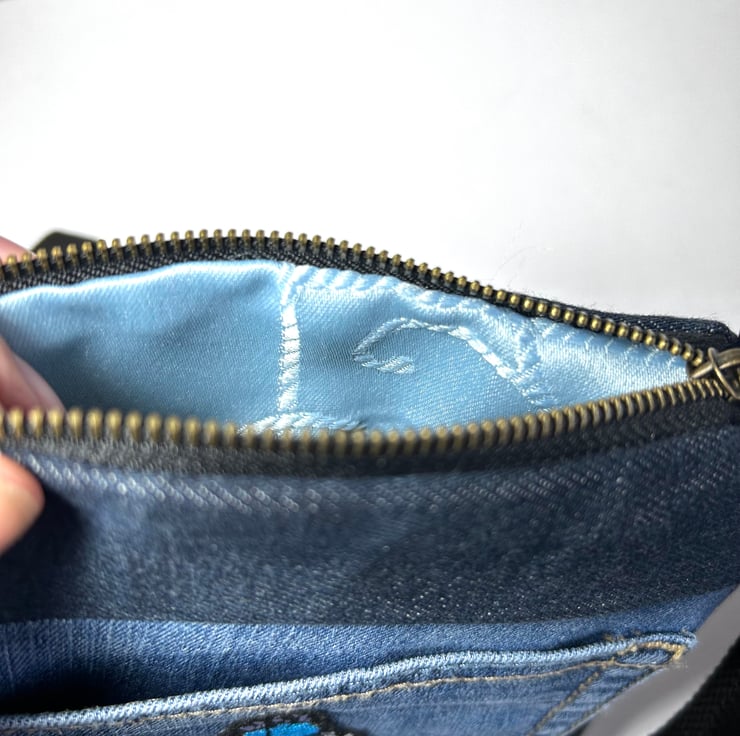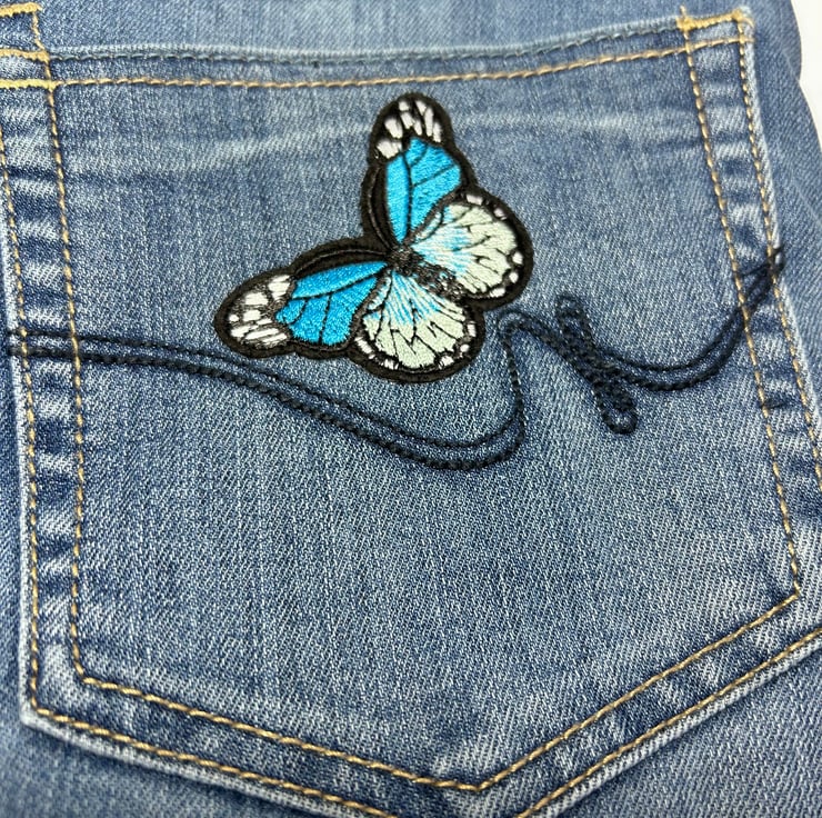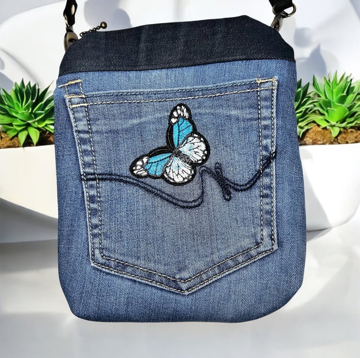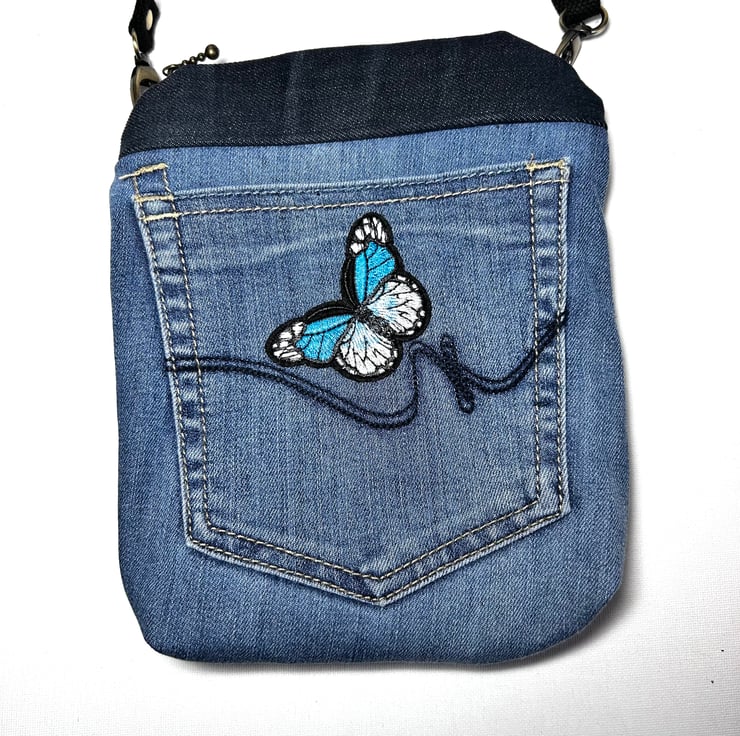 Upcycled denim bag made from repurposed denim jeans. Utilising the jeans pocket on the front with a colourful butterfly patch.