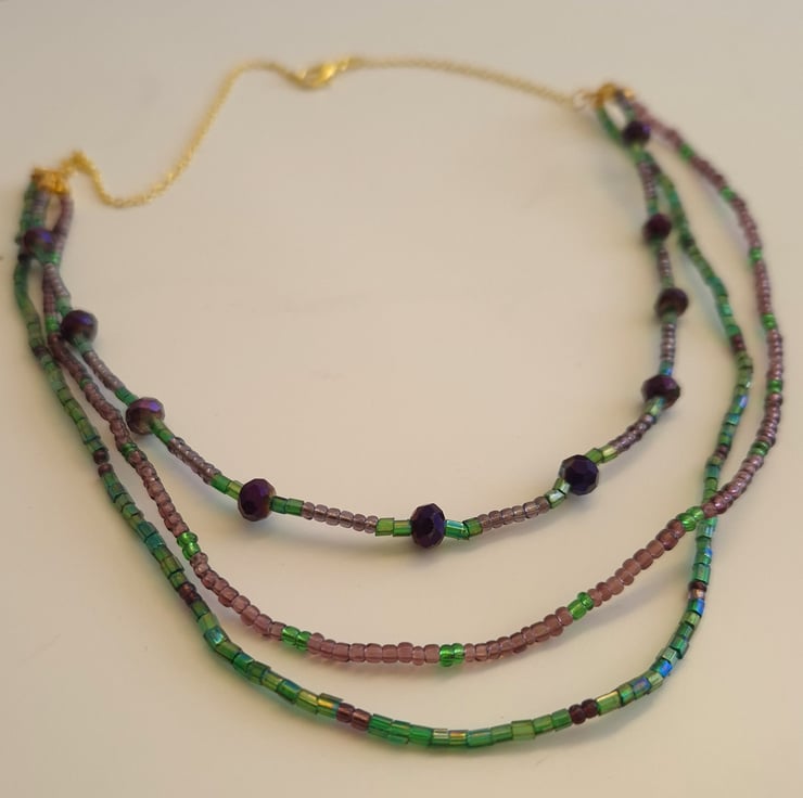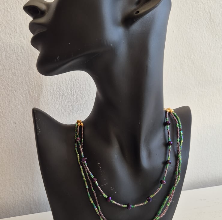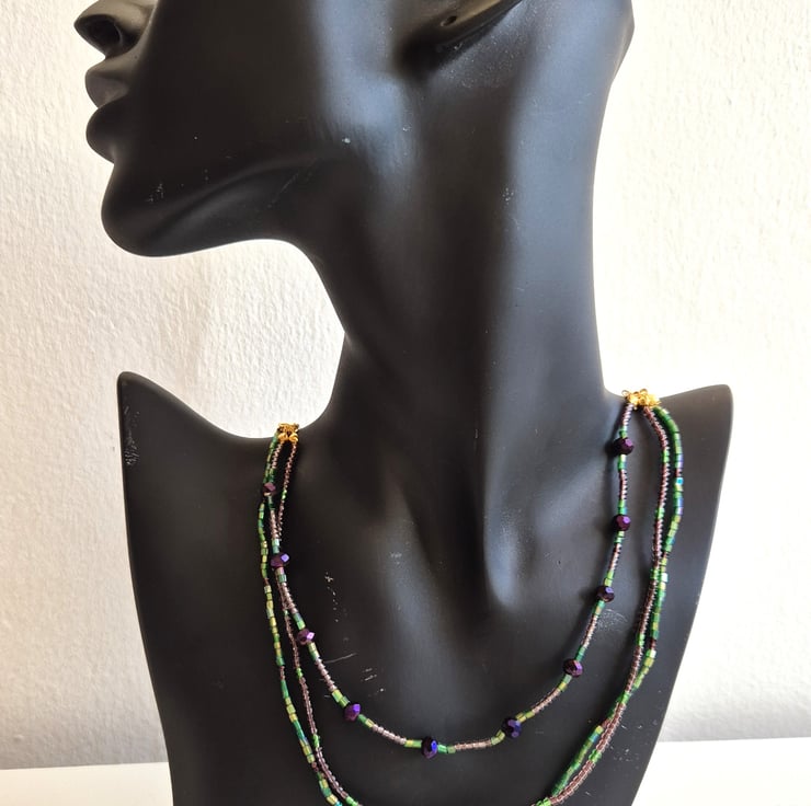 Each stand of beads is slightly different length and pattern to create a layered affect.