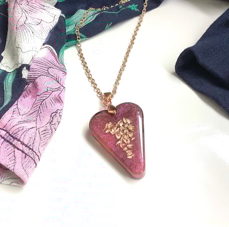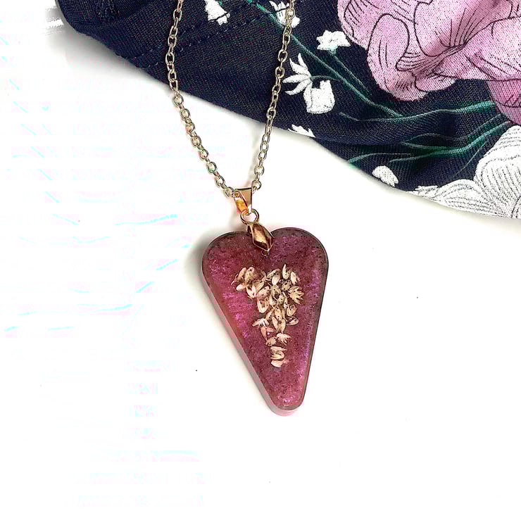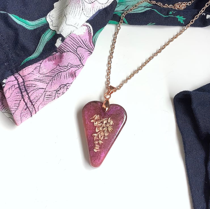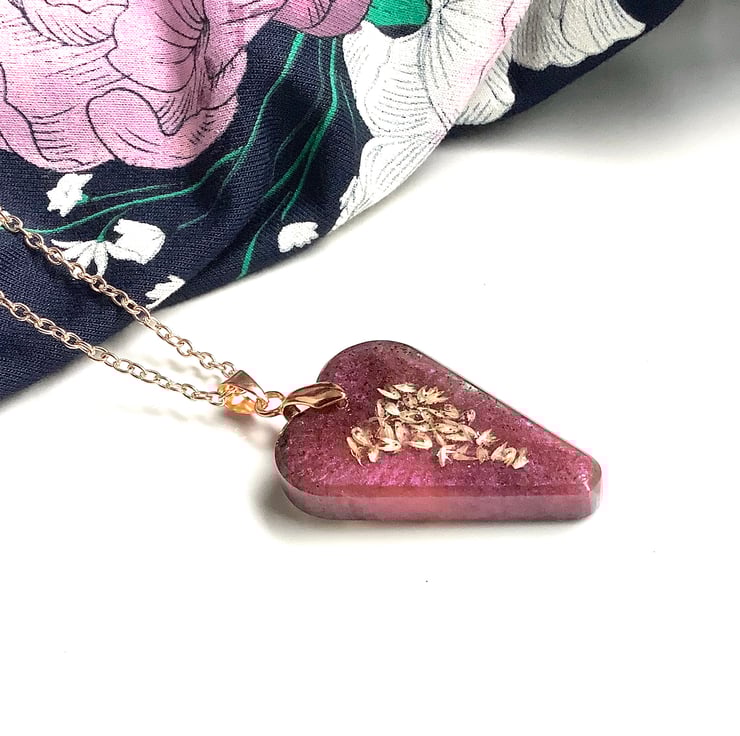 Beautiful heart shaped / petal shaped resin pendant: seeds set in dusky pink with touch of deep purple; supplied with rose gold coated chain. Looks lovely with smart evening outfit. Great gift for your friend, mum or treating yourself.