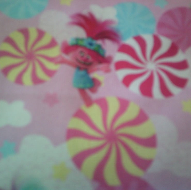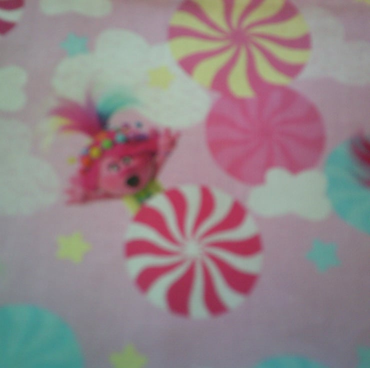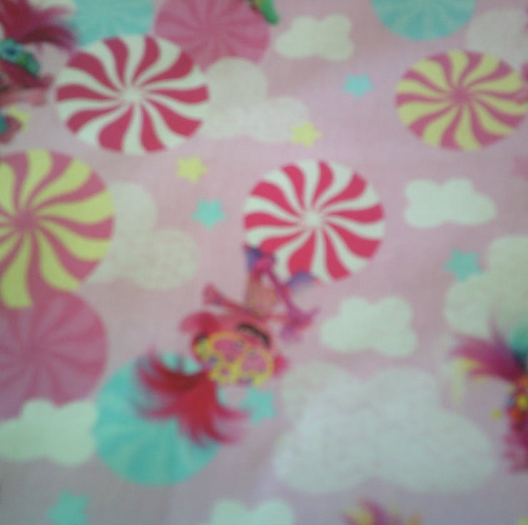 The fabric used has an overall design of Trolls and pinwheels on a pale pink background.