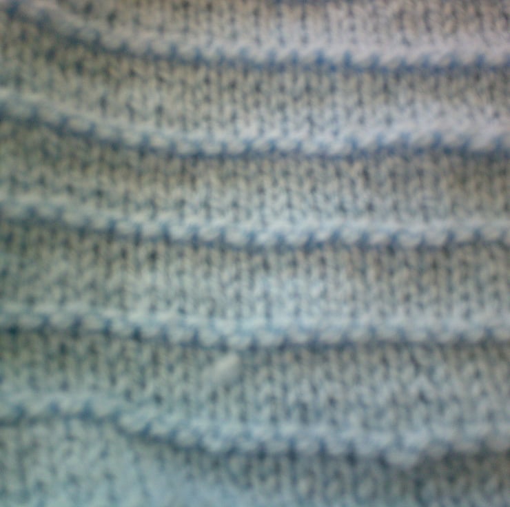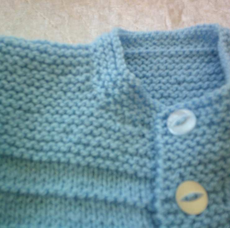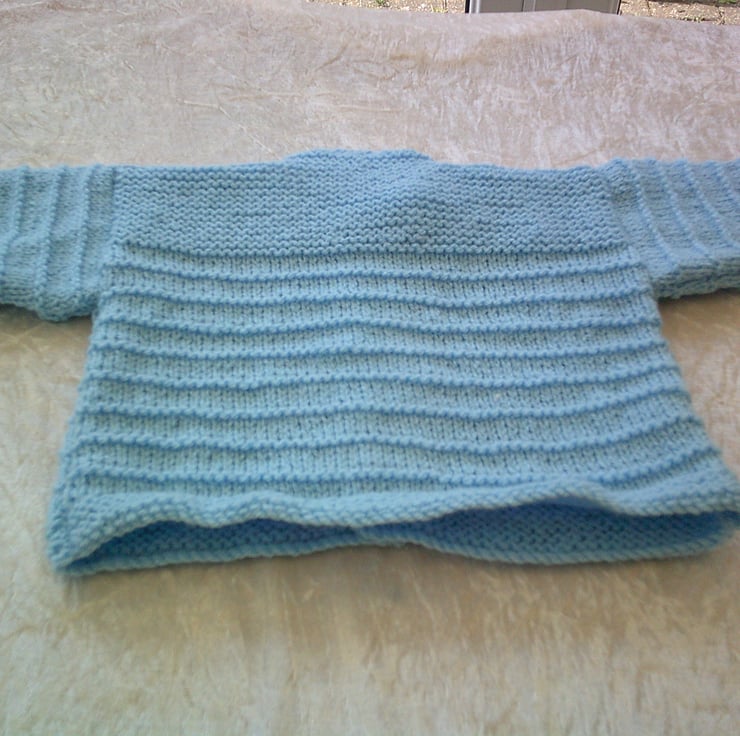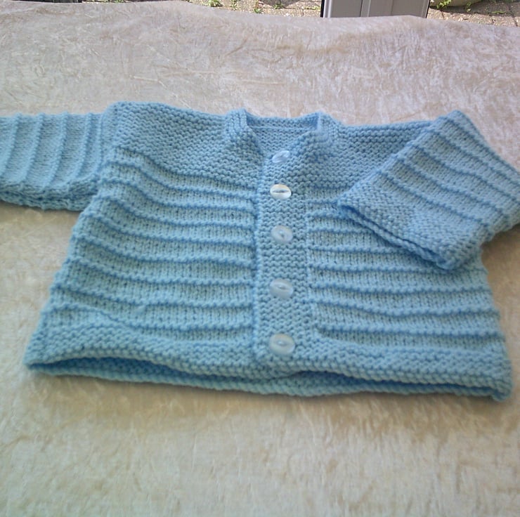 This hand knitted Blue Round Neck cardigan is made using acrylic yarn and a design of garter stitch stripes and a garter stitch yoke double moss stitch ladders over the fronts, back and would make a lovely addition to a babies wardrobe.