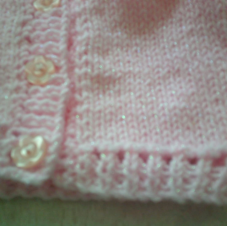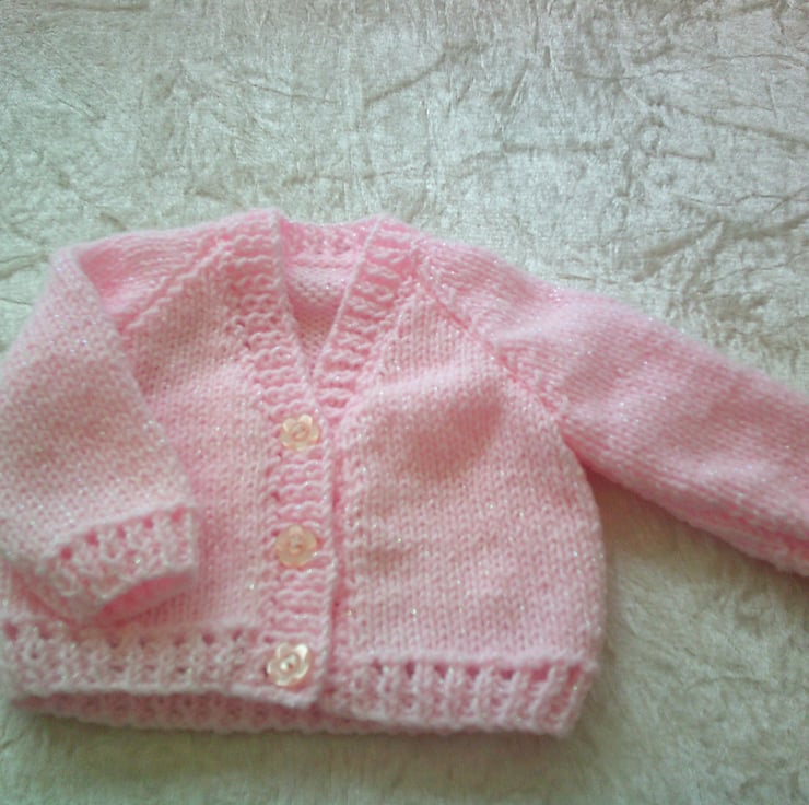Hand knitted using acrylic yarn this V neck cardigan is ideal for a new baby girl as it is made using pink acrylic yarn.