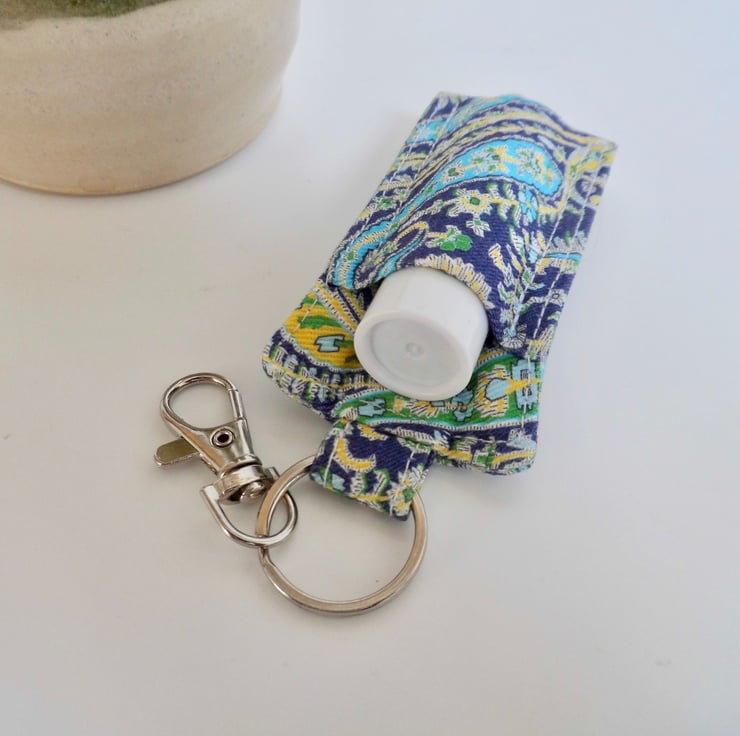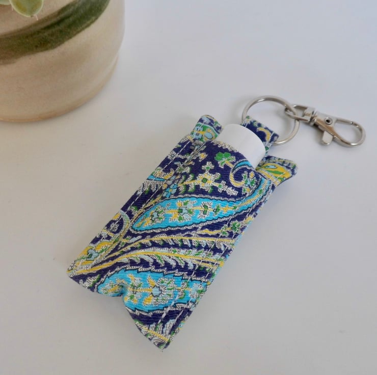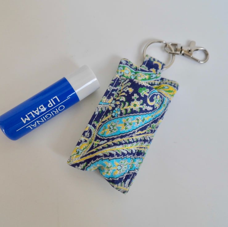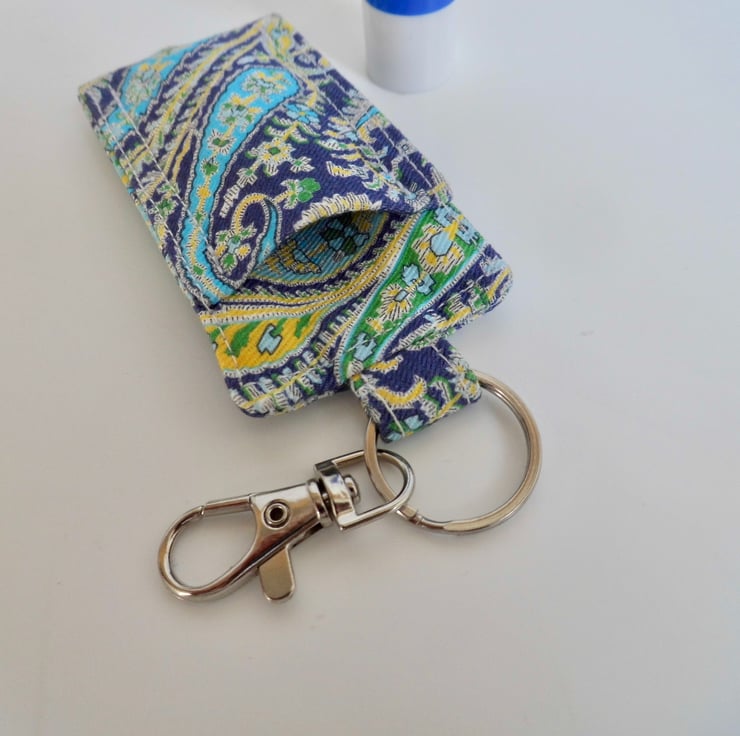 This is a little fabric pouch designed to keep your lip balm stick handily clipped to your bag, purse etc. For this one, I used a modern paisley fabric in blues and greens from Liberty.