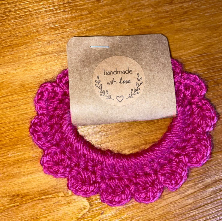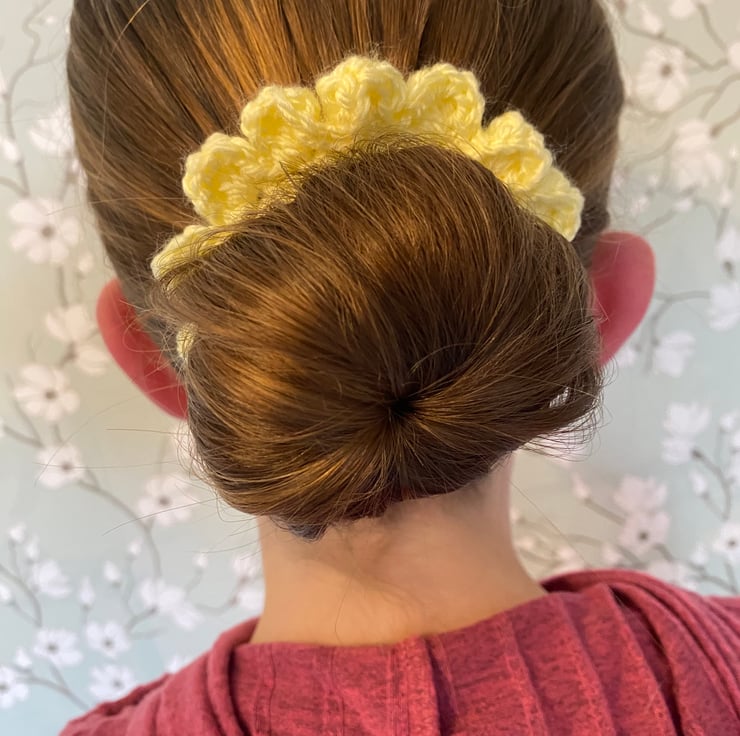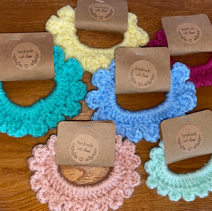 Pretty crochet scrunchie with frills, in yellow. Available in most colours. Made to order. A perfect accessory