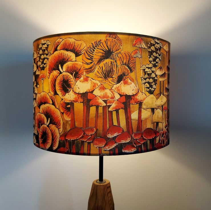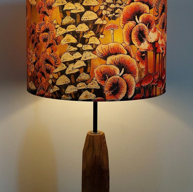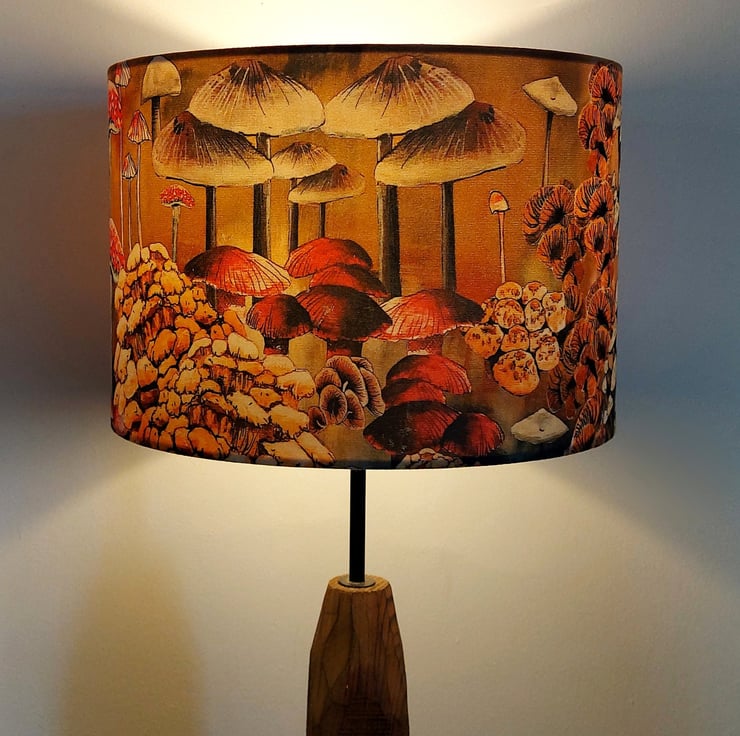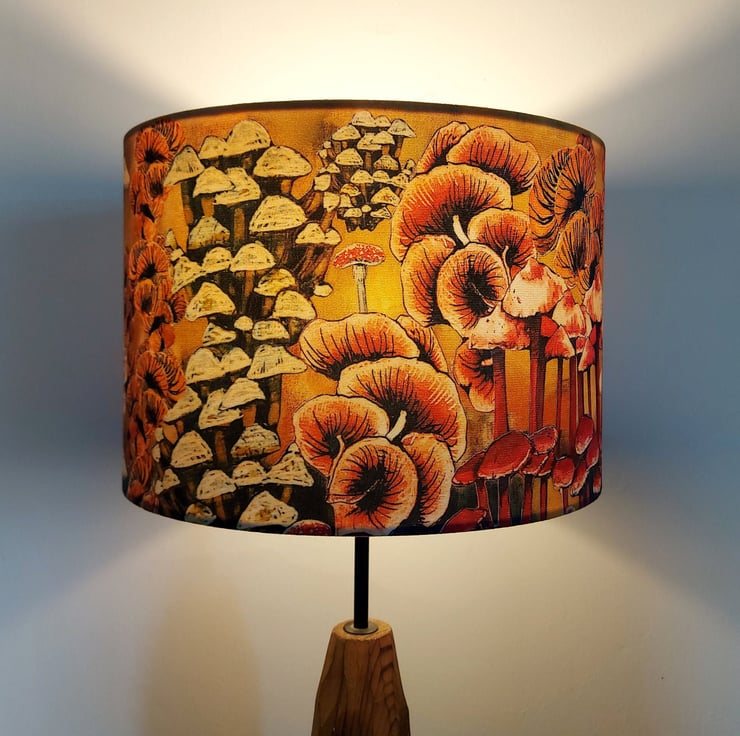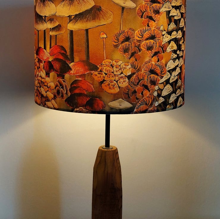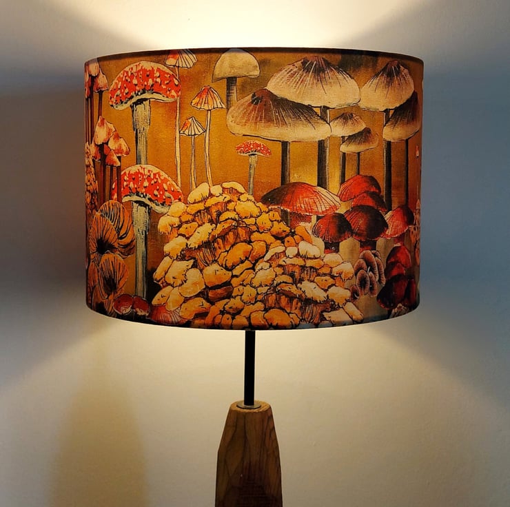 Bring a touch of nature into your home with this beautiful drum lampshade, featuring Lily Greenwood’s original ‘Mushrooms and Fungi’ design. Inspired by retro 70s textiles, this piece adds a playful, artistic feel to any room.