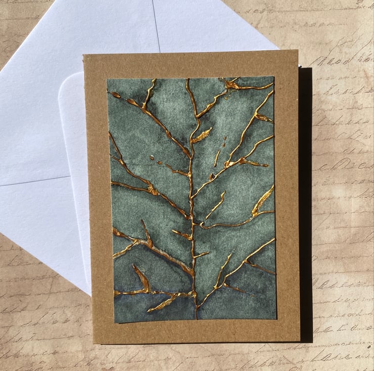 A shimmering gold tree glows against a forest backdrop in this hand-painted greeting card, crafted with deep green watercolours and finished with raised gold relief detailing. The textured gold catches the light like sun on bare branches, creating a tactile, miniature artwork that invites touch as well as admiration.