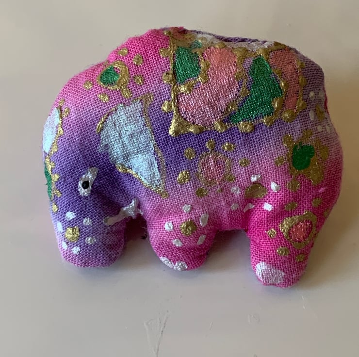 Handmade tie dyed fabric Elephant shaped brooch with hand-painted designs in shimmering colours. Finished with safety pin fixing.
