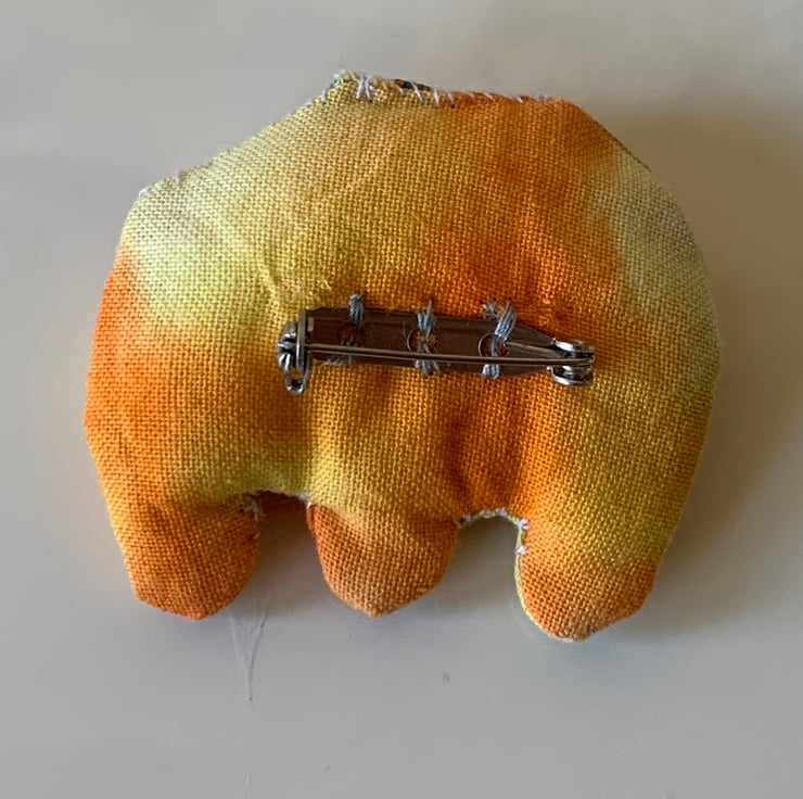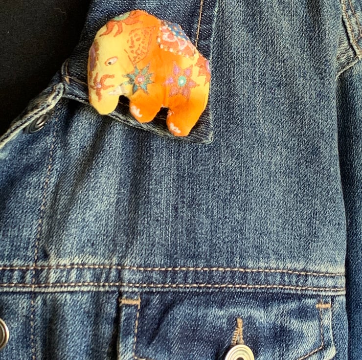 Handmade tie dyed fabric Elephant shaped brooch with hand-painted designs in shimmering colours. Finished with safety pin fixing.