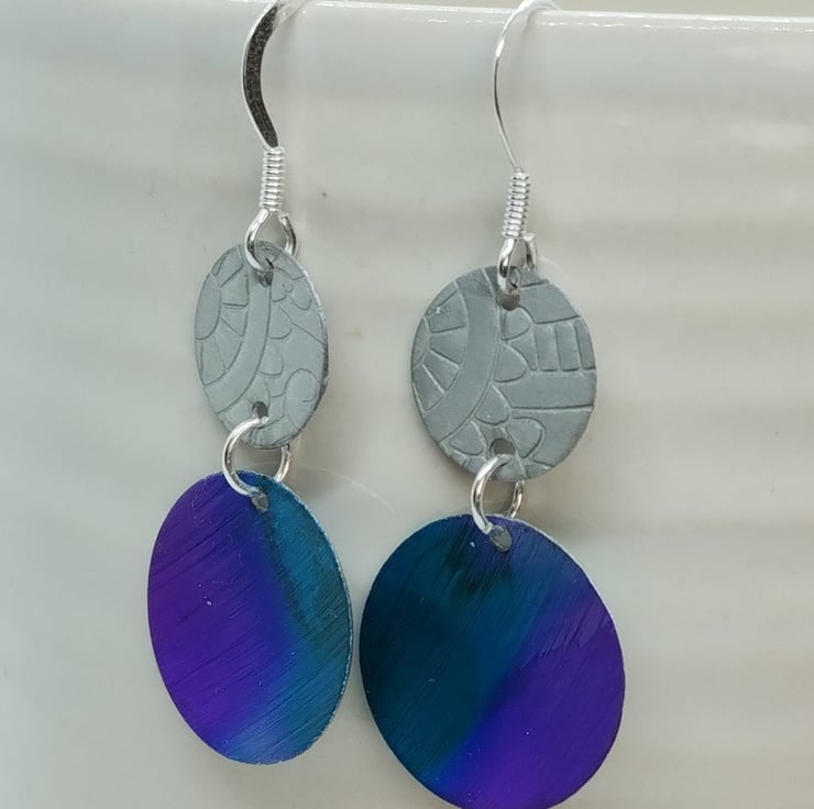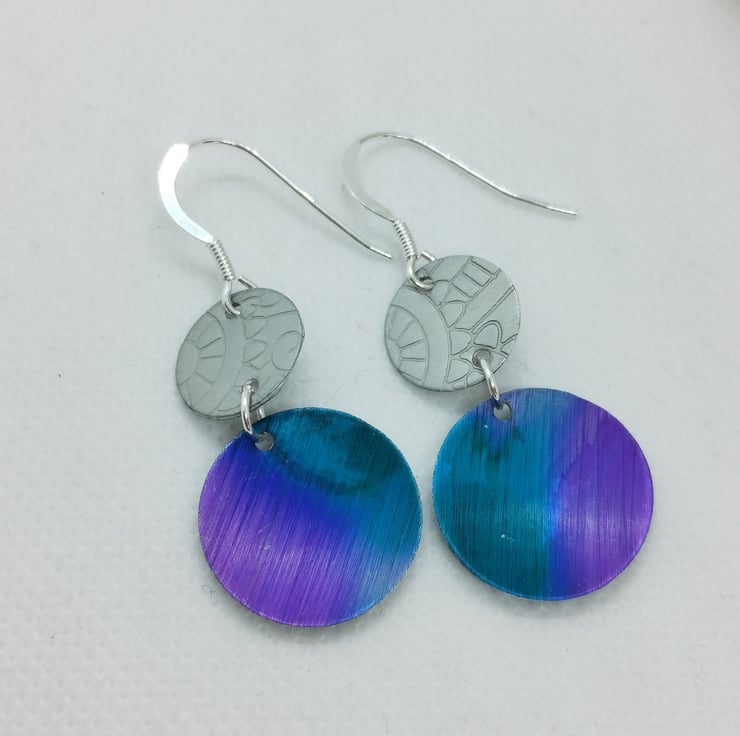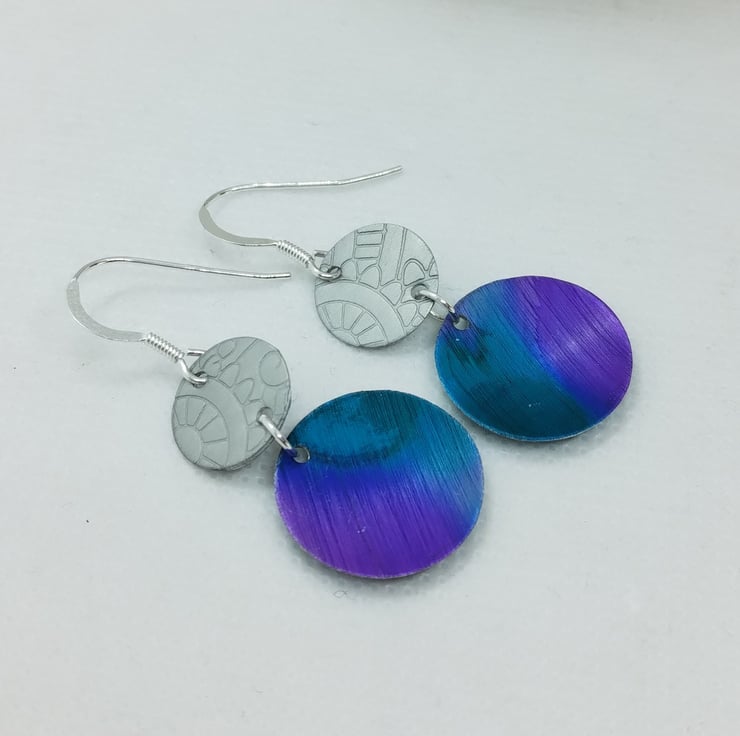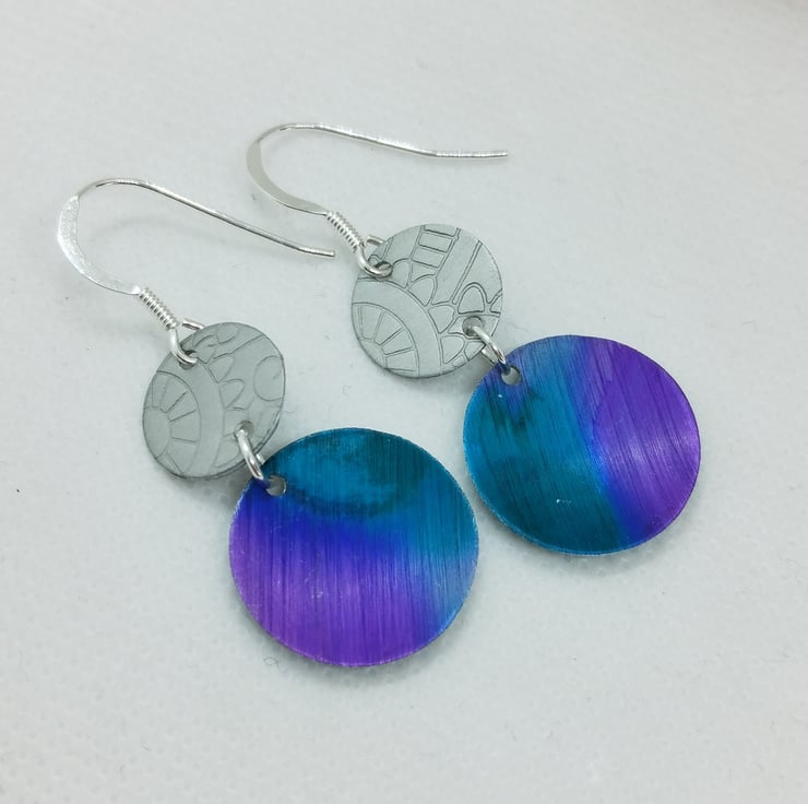 These lightweight aluminium earrings are hand dyed. The top circle is textured with a paisley design. The ear hook is made of sterling silver. They measure 4.75 cm in length.