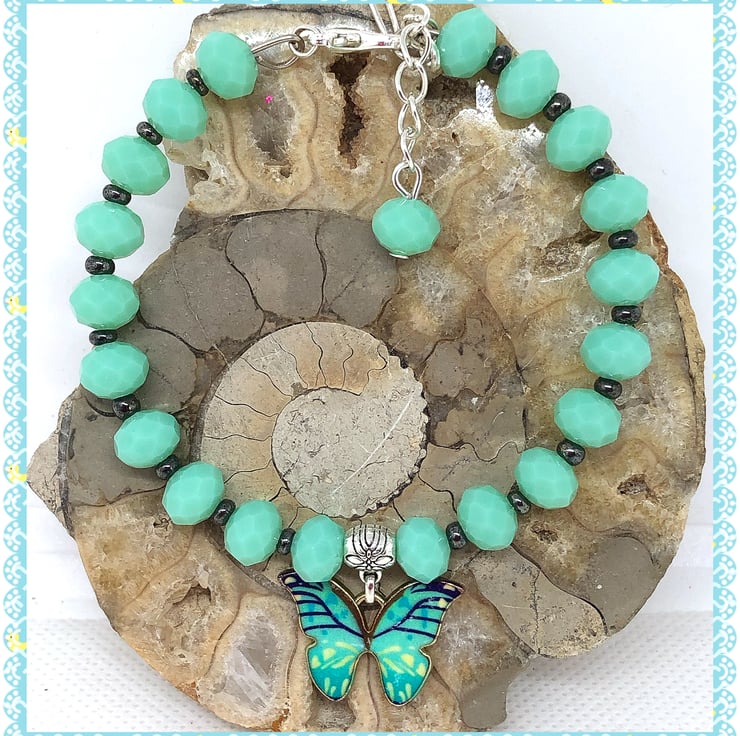 Created using this lovely enamelled butterfly I’ve threaded faceted rondels & black seed beads to compliment this lovely charm to form this pretty bangle style bracelet. Tibetan silver connector, extension chain & trigger clasp. Nickel free