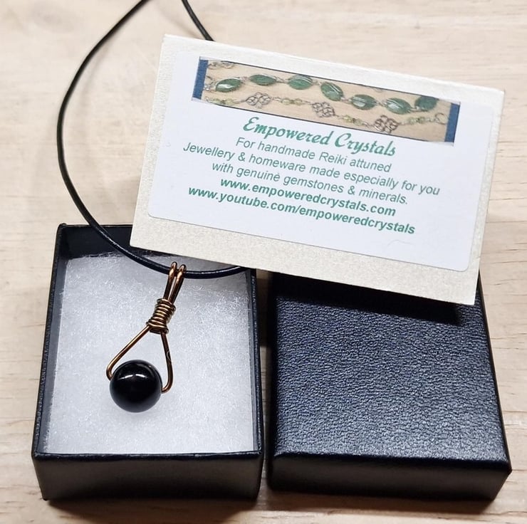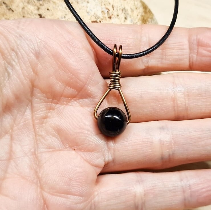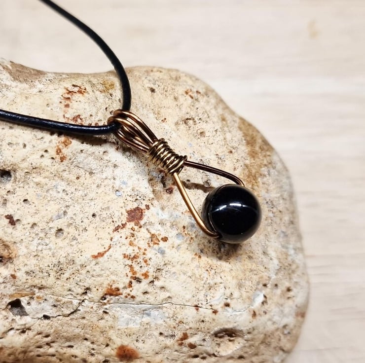 This is a unisex black Shungite triangle pendant necklace. I have wire wrapped this with antique brass coloured coated copper wire.