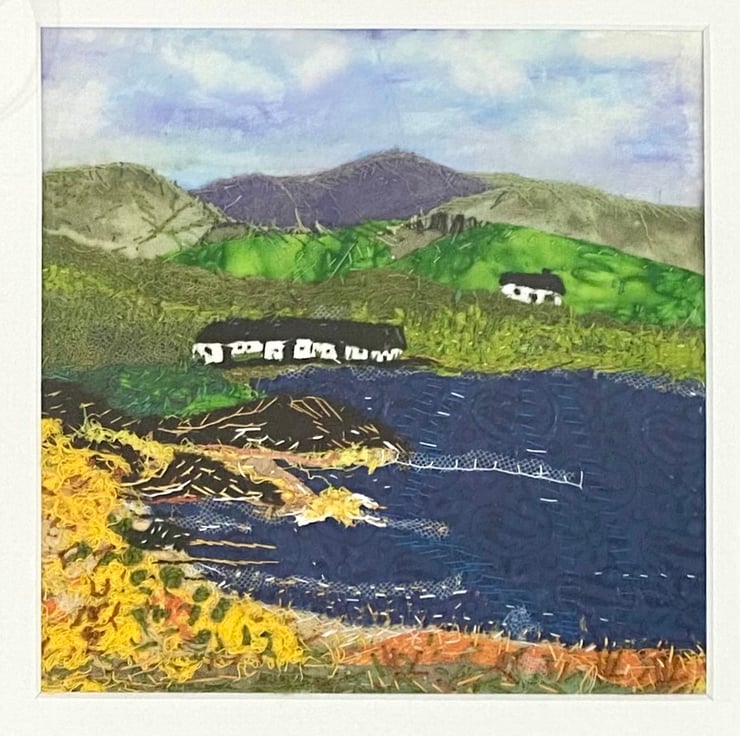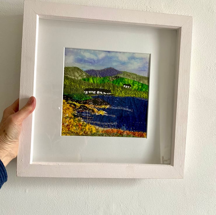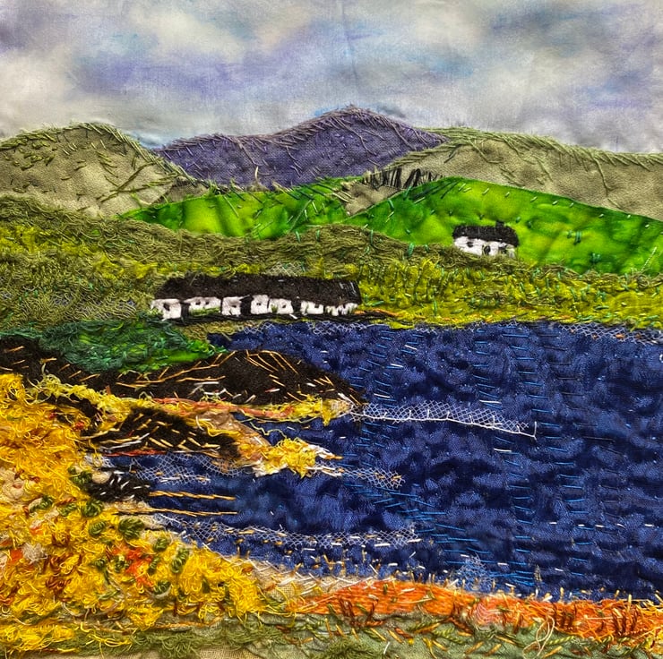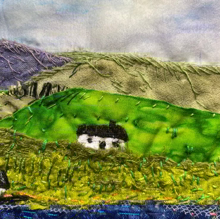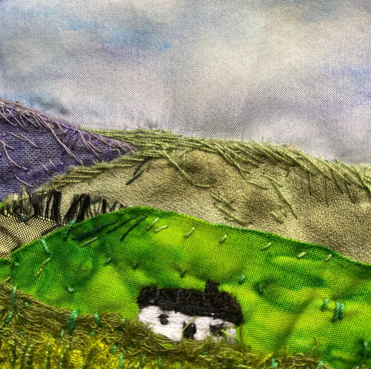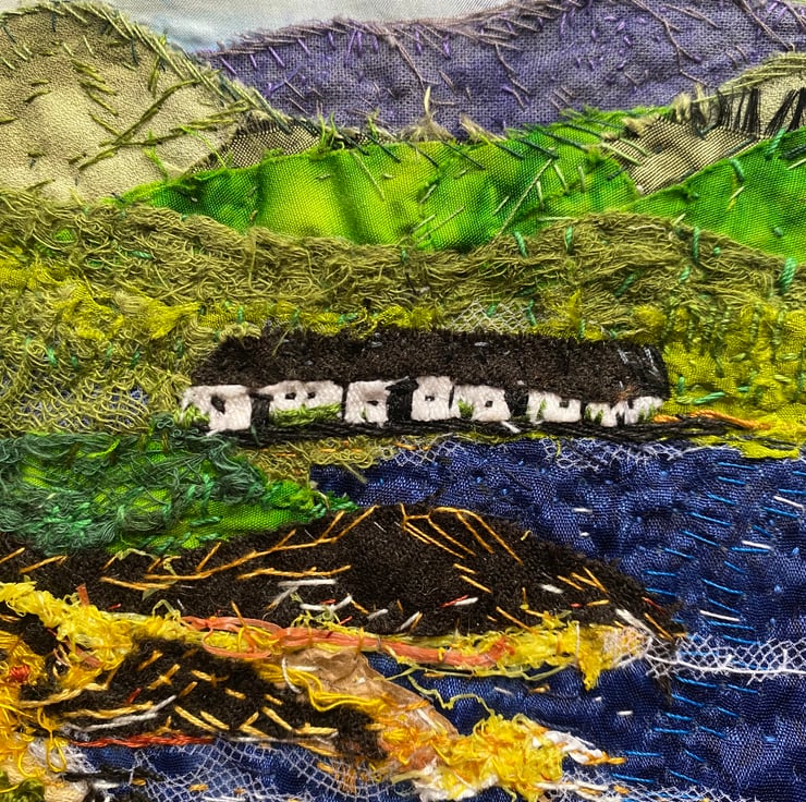 Hand embroidered textile collage. I’ve used a mix of pre loved fabrics a little bit of paint and hand embroidery stitches.