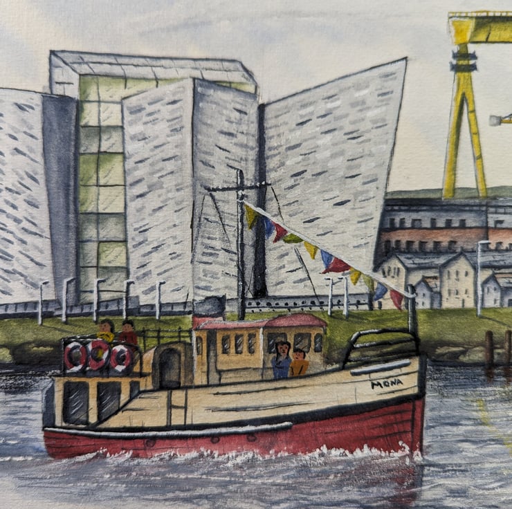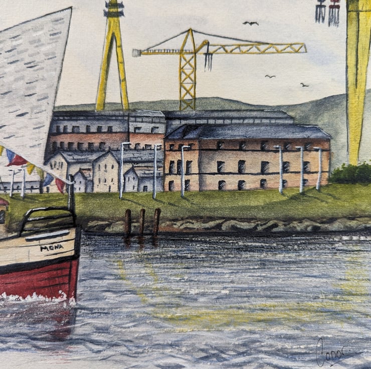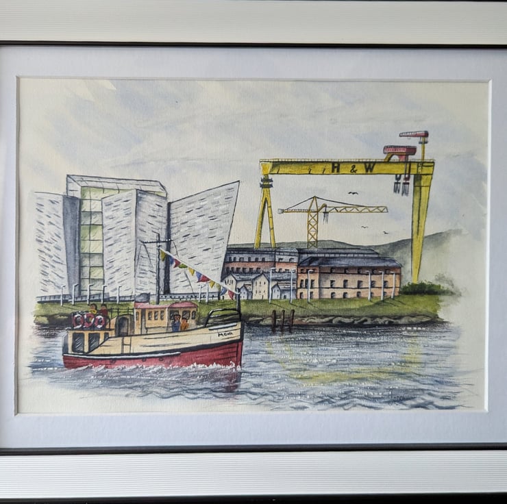 An A4 (297mm x 210mm) print of my original watercolour of Belfast Docks, Titanic quarter and Samson & Goliath.
