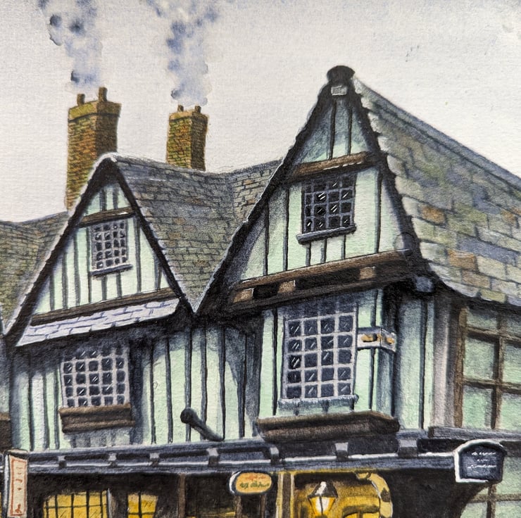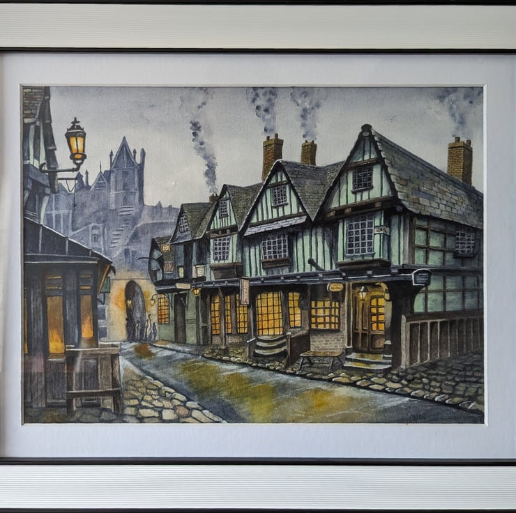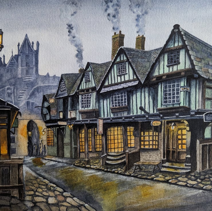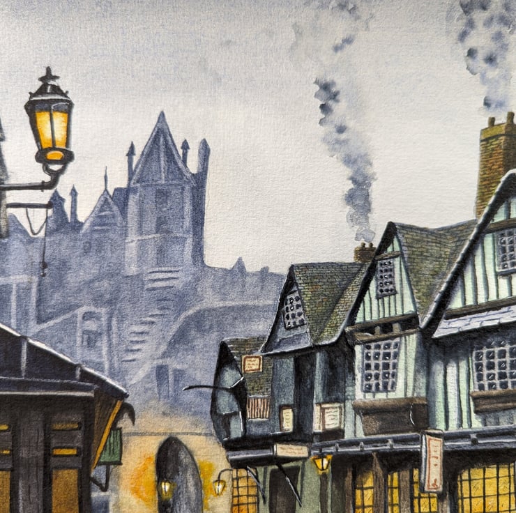 An A4 (297mm x 210mm) print of my original watercolour of Harry Potters Hogsmeade Diagon Alley, with Hogwarts in the background.