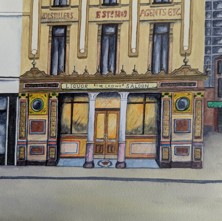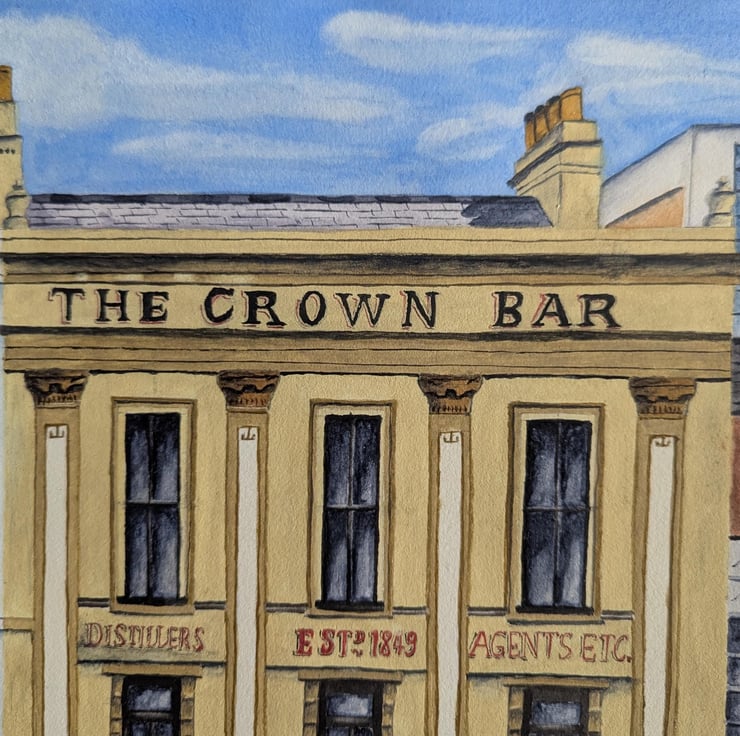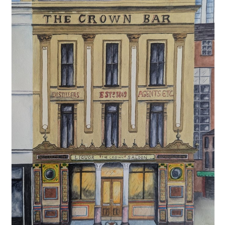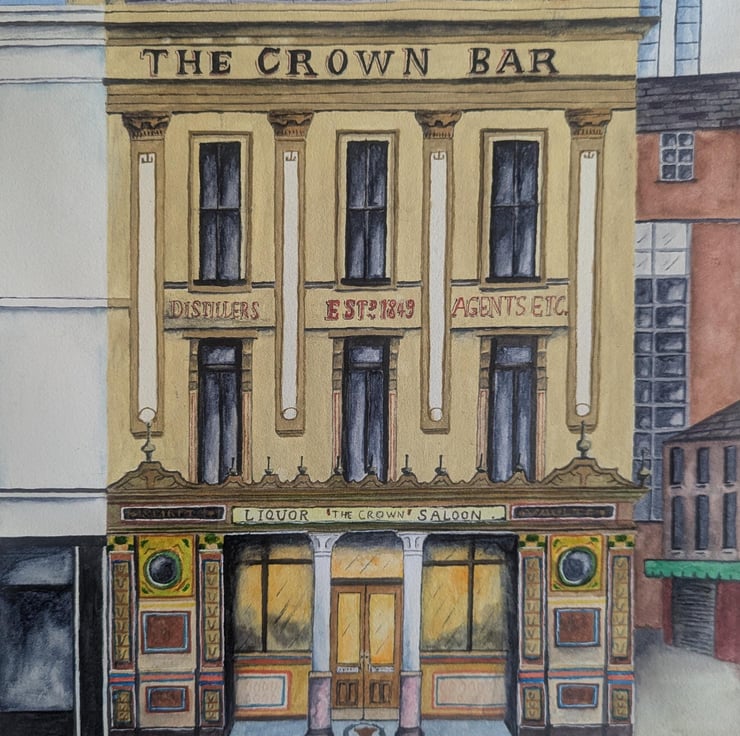 An A4 print (210 x 297mm) of my original painting of The Crown Bar, Belfast.