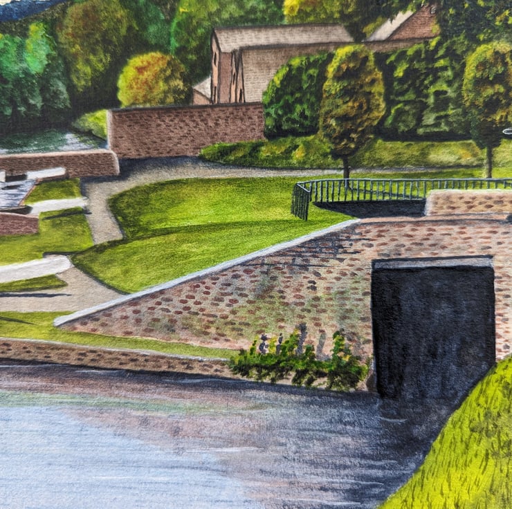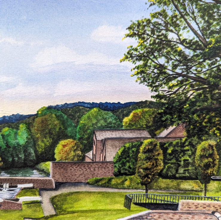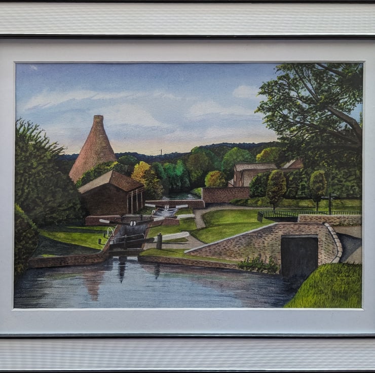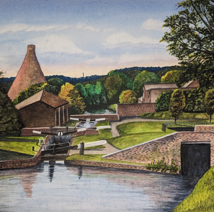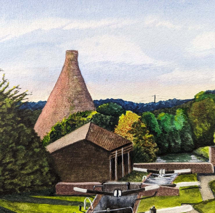 An A4 (297mm x 210mm) print of my original watercolour of Stourbridge locks and canals, and Red house glass cone.