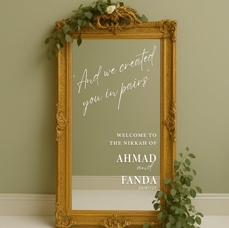 Add a poetic, heartfelt touch to your Nikkah celebration with this elegant vinyl welcome sticker. Featuring the beloved verse “And We Created You In Pairs” in a graceful handwritten-style script and personalised with the couple’s names and date, this modern design is perfect for mirrors or welcome boards at your Islamic wedding.