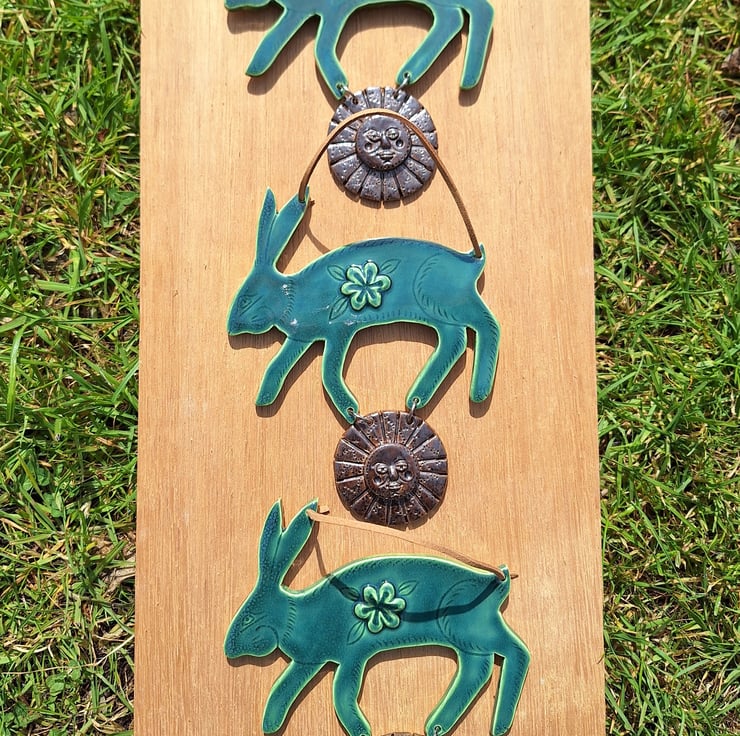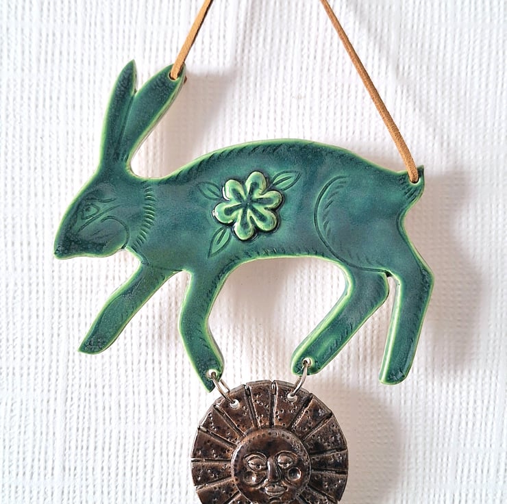 The hare is finished in a beautiful shimmering green/blue ceramic glaze with a metallic bronze sun hanging from stainless steel rings. Hangs from a vegan 'suede' cord.