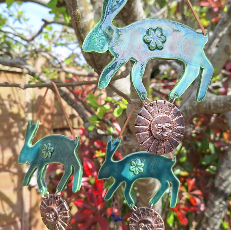 Folklore traditions love the hare - a symbol of rebirth, fertility, magic and mystery! Often depicted as gazing at the moon, it seemed more appropriate to team my hanging hares with the sun, since May is all about Summer icummen in!