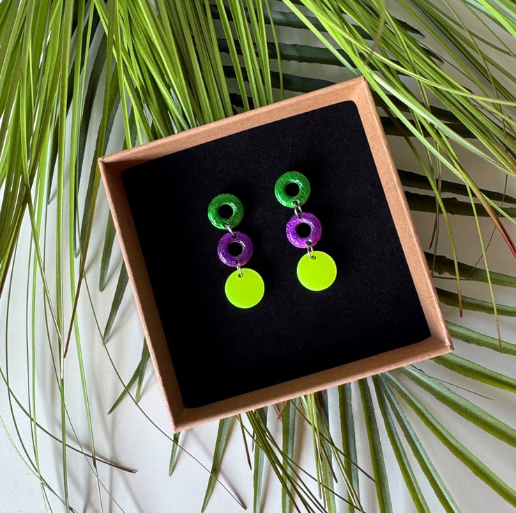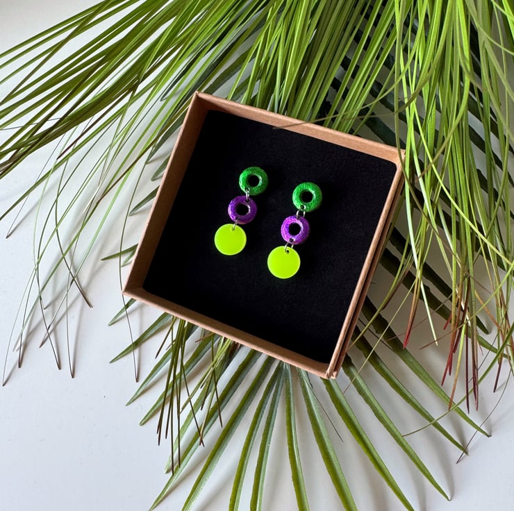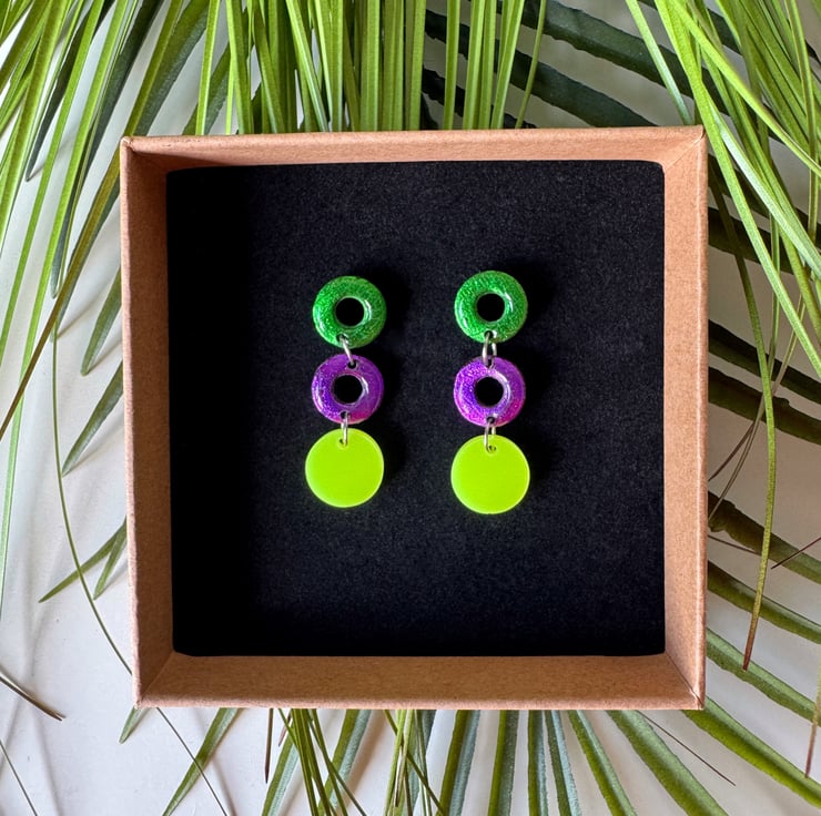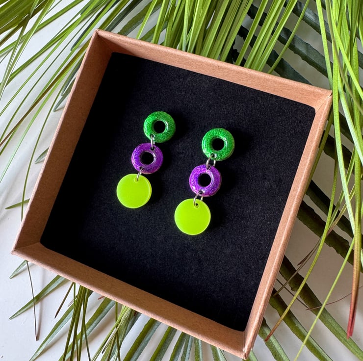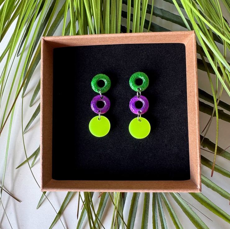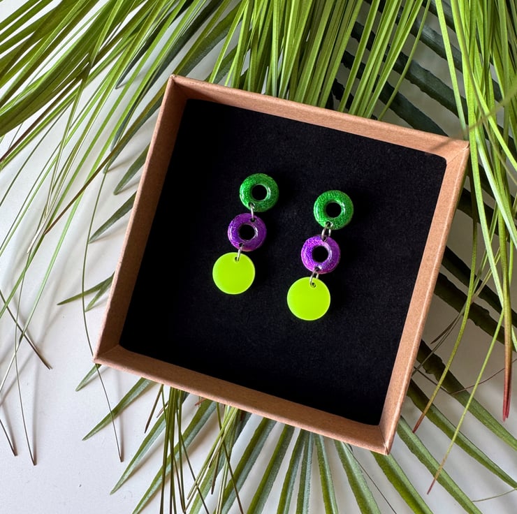 Handcrafted from a vibrant mix of polymer clay and acrylic, each lightweight earring features stacked rings in electric green and shimmering purple,