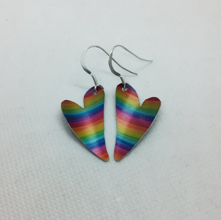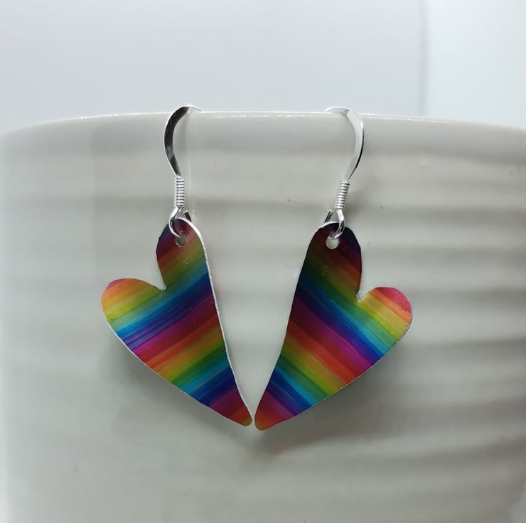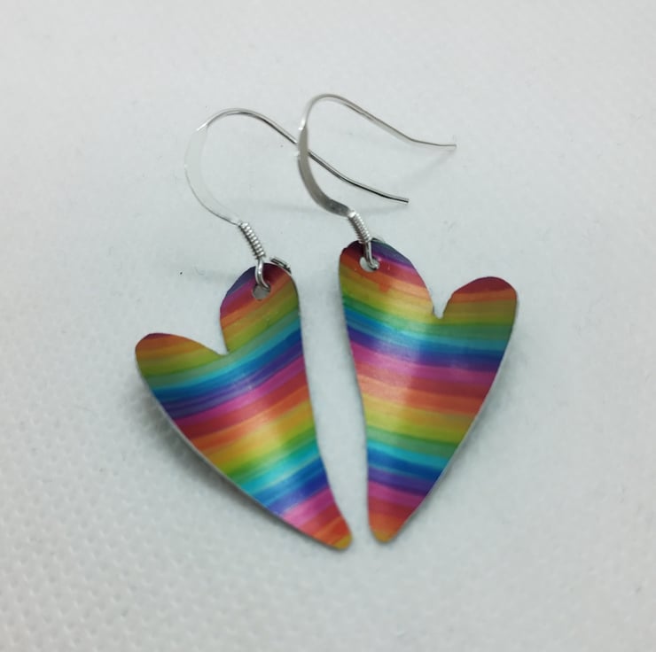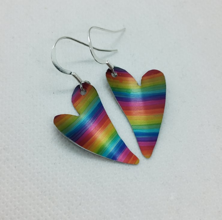 These lightweight aluminium earrings are hand printed in bright rainbow stripes. The ear hook is made of sterling silver. They measure 4.2 cm in length.