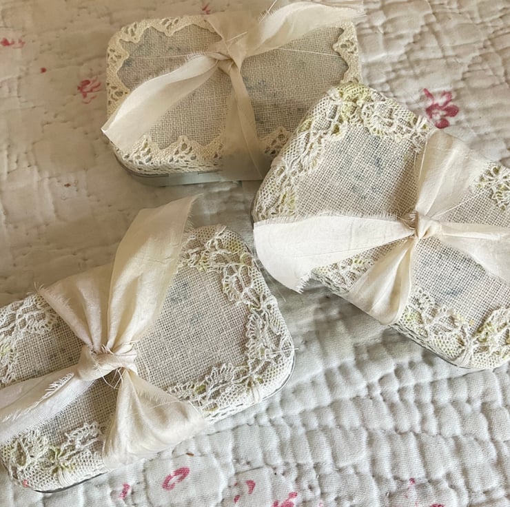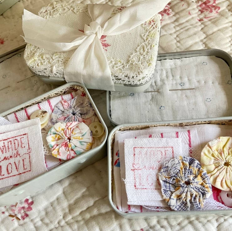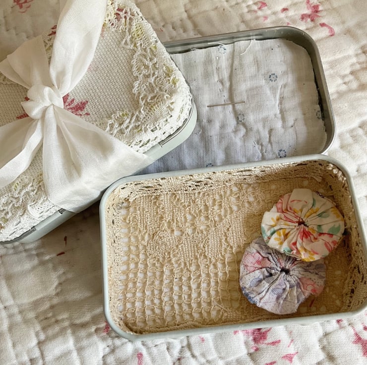 On the outside of each tin, the top has been decorated with vintage fabric, which has been framed with vintage lace. The inside lid is lined with a piece of antique quilt, which is padded, enabling it to hold a needle (supplied).
