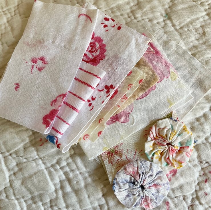 The base of the tin has been lined with vintage lace, and then filled with a selection of small pieces of vintage and antique fabric prints, sufficient to cut out 2 or 3 tiny circles (card template provided) to make my signature mini Suffolk puffs/fabric yo-yo’s.
