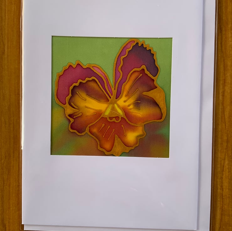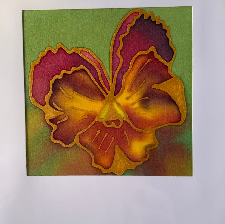 The silk painting itself is 3.75” x 3.75” inches. It’s outlined in metallic gutta and features a pansy flower head detail.