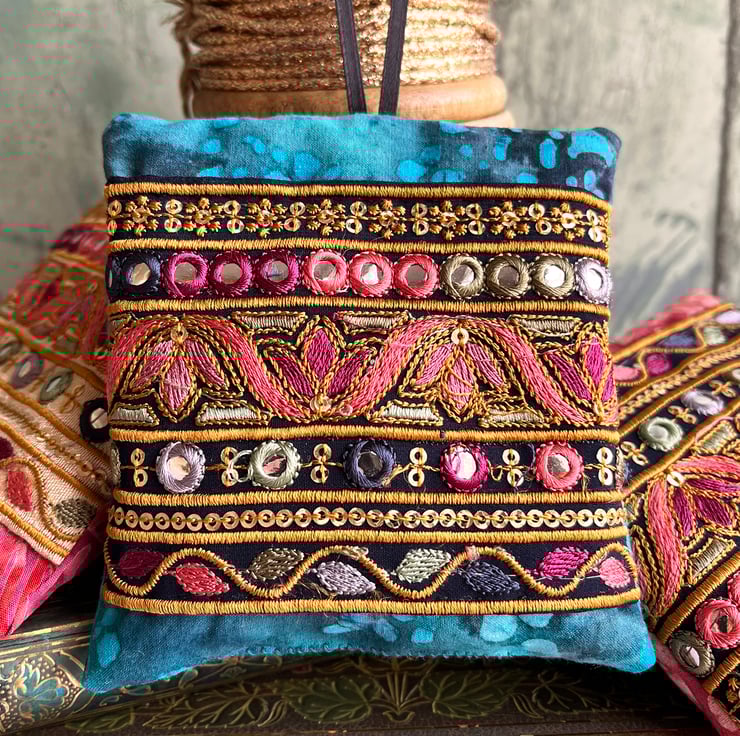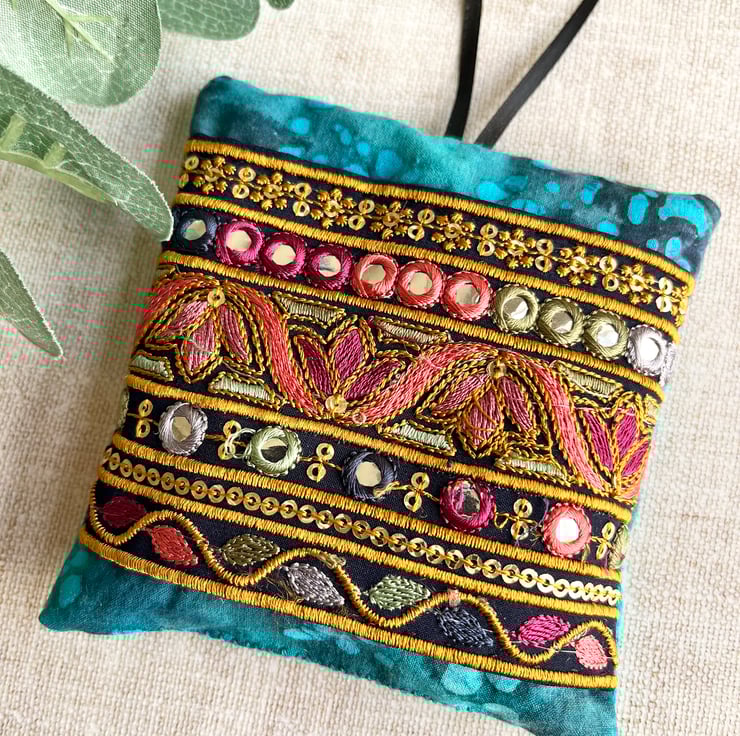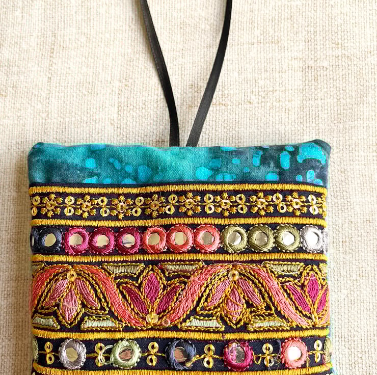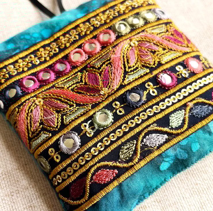 The front is decorated with a section of pretty embroidered Indian trim which has been hand stitched onto batik fabric. I've used black ribbon for the hanging loop which is about 10cm in length.