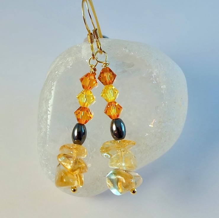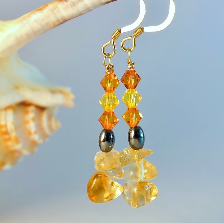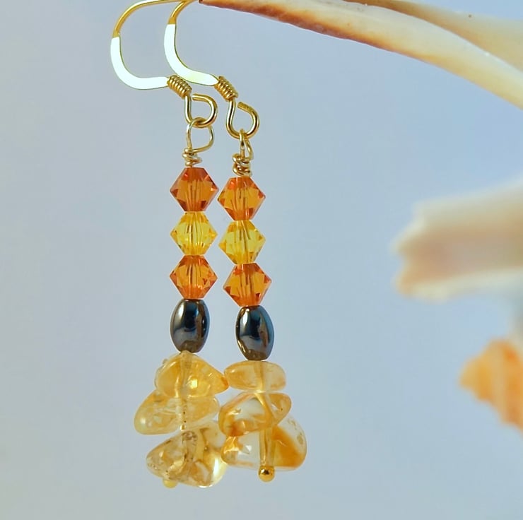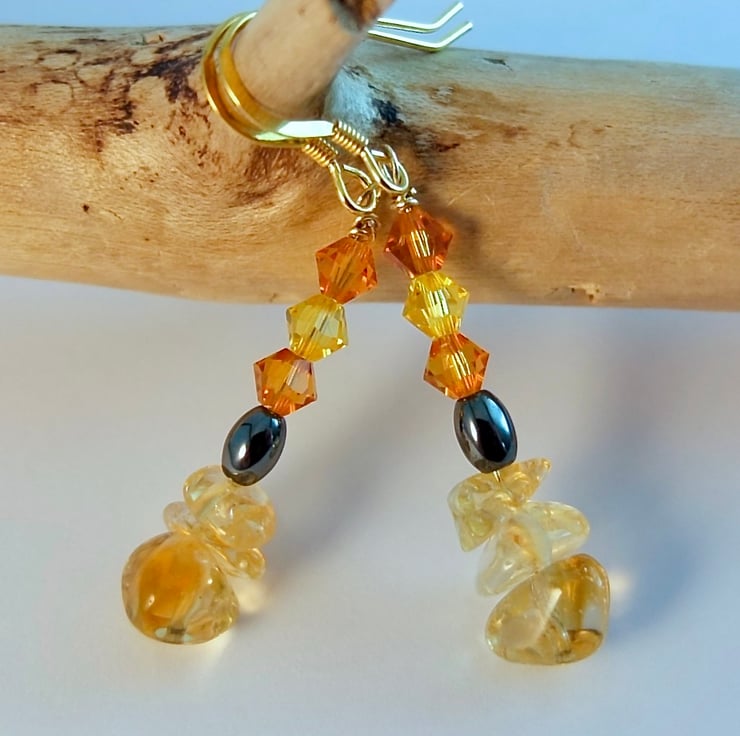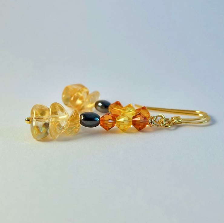 Each earring features a trio of natural, pale yellow Citrine niggets, a 3x5mm Haematite rice bead and a trio of 4mm top quality Austrian crystal bicones in the colours 'topaz' and 'light topaz'.