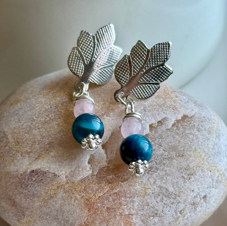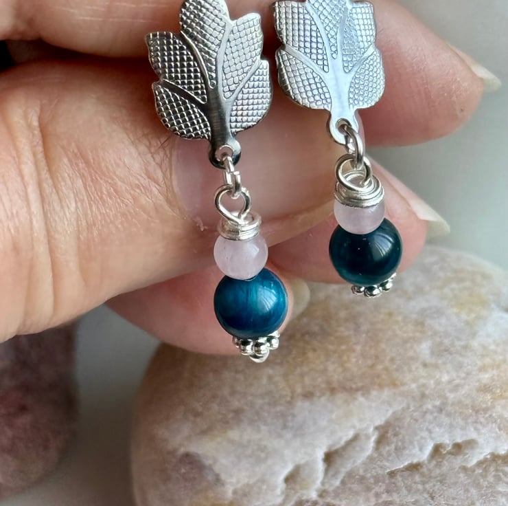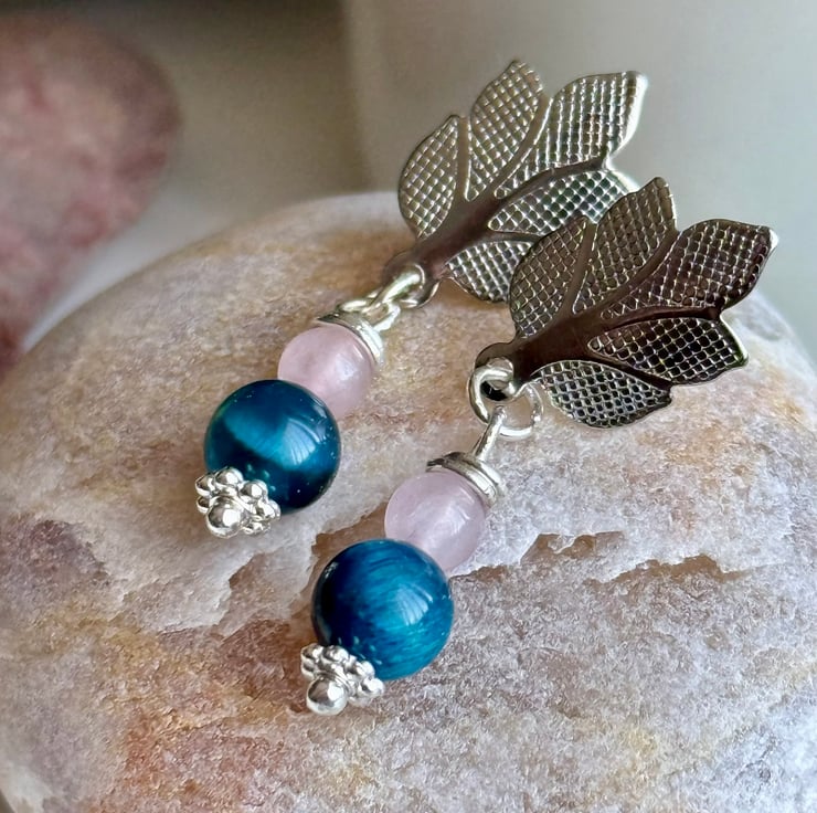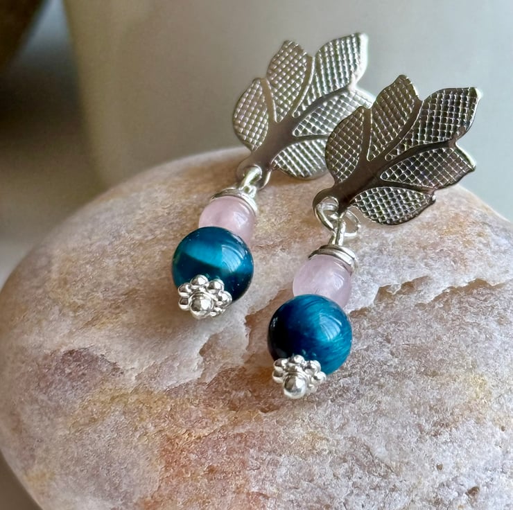 Handmade One-of-a-kind earrings. Blue Tiger eye with amazing tones and hand wrapped Rose quartz hung from a Stainless steel patterned leaf shape stud earring. Other accents are also stainless steel. These are lightweight so ideal for all day wear.