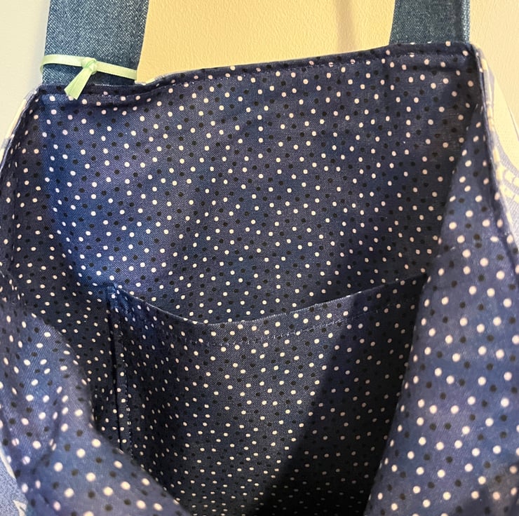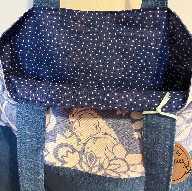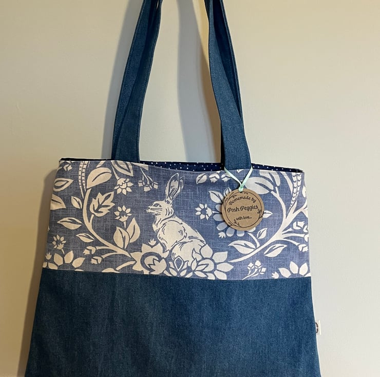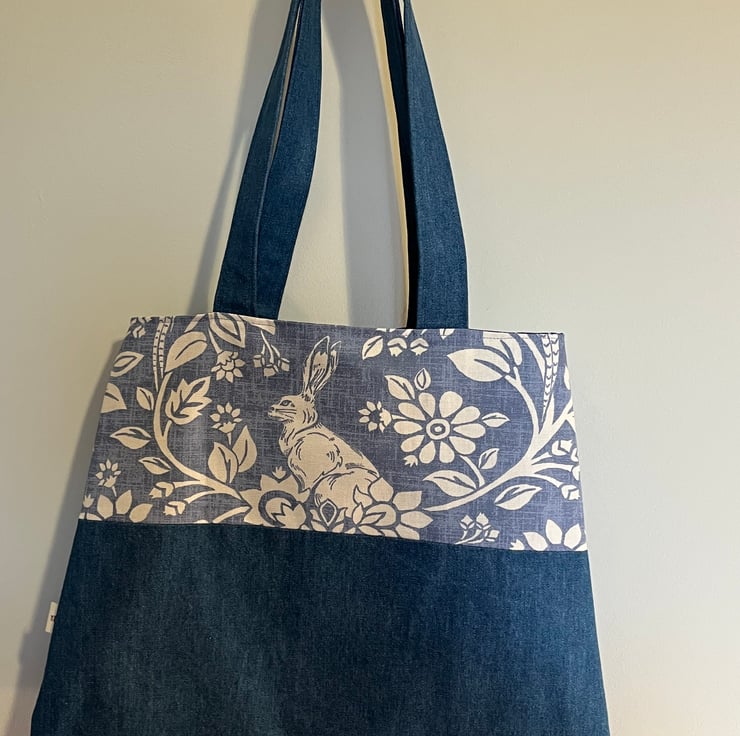 Denim bag with hare and floral cotton fabric, fully lined and with a handy internal pocket. 32 cm high, 39 cm at base to 31 cm at top.