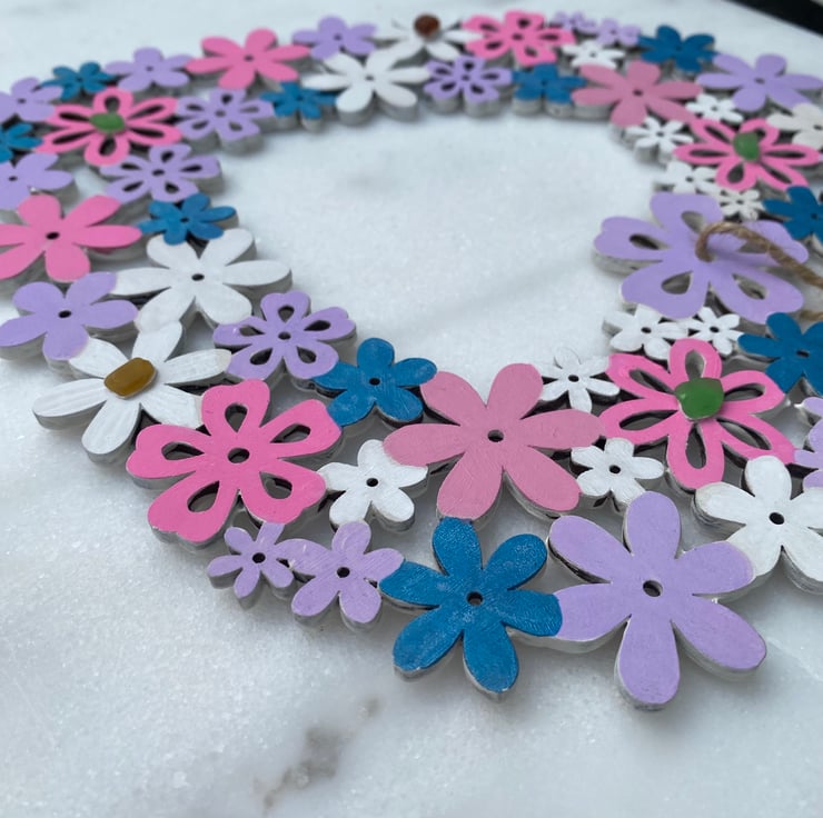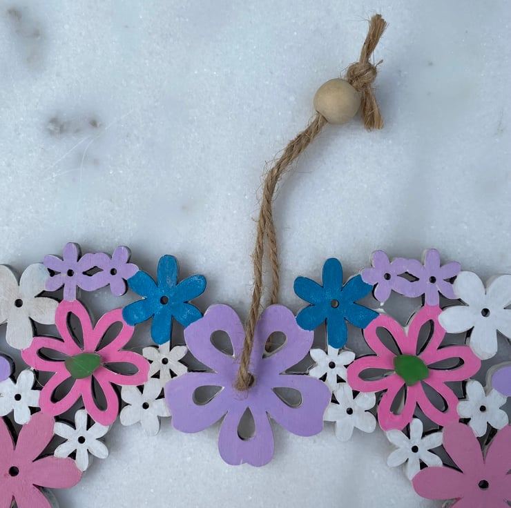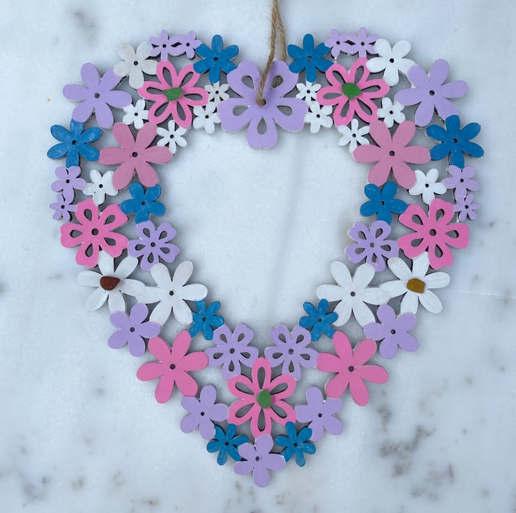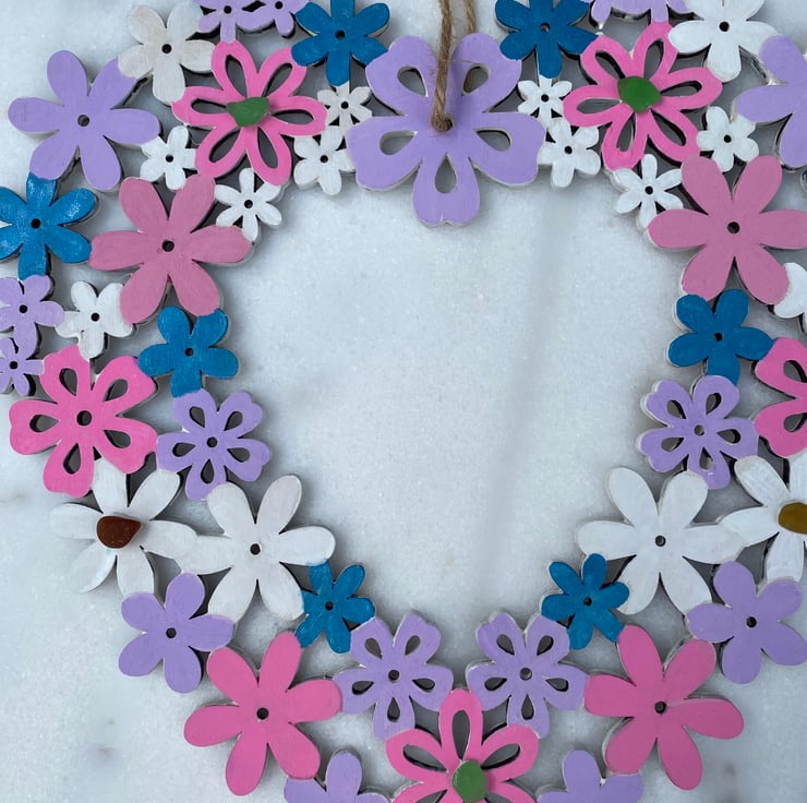A pretty pre made wooden floral heart that I have hand painted with acrylic paint and decorated with 5 pieces of sea glass.