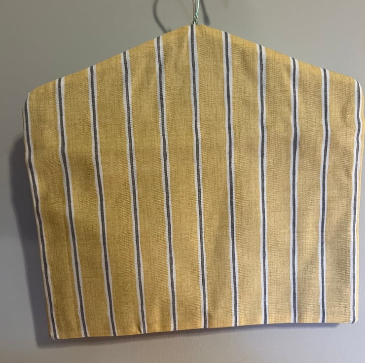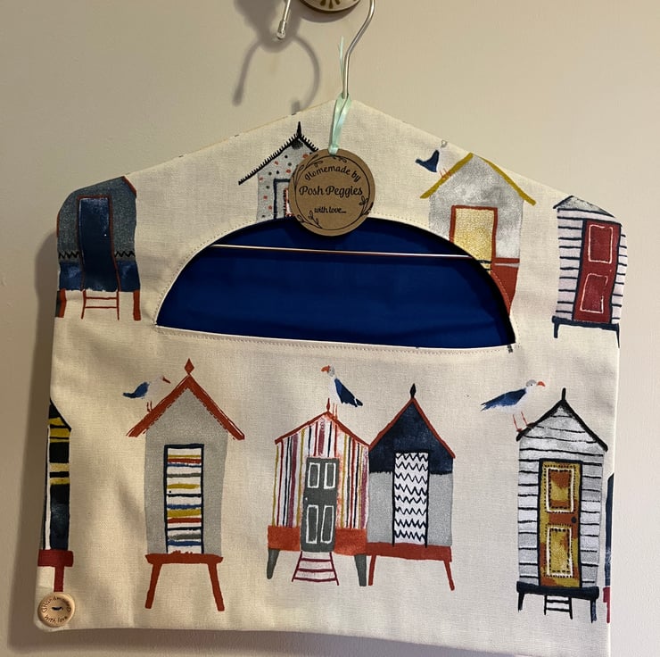 Fabric peg bag with heavy duty stainless steel hanger, 31.5cm tall by 34cm wide. Beach hut print fabric to from, yellow, white & grey stripe to back and royal blue cotton lining.