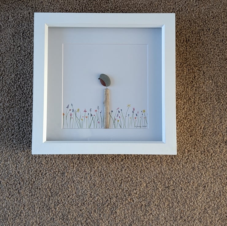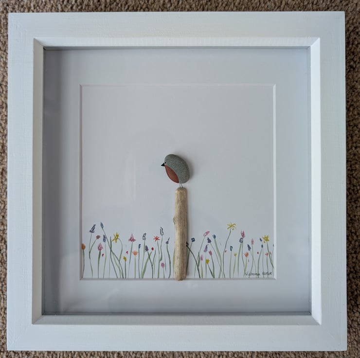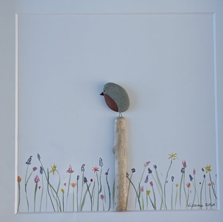 This delightful little robin is hand painted with acrylic markers and surrounded by a spring time watercolour garden. He is perched on a drift wood fence post nestled in the flowers.