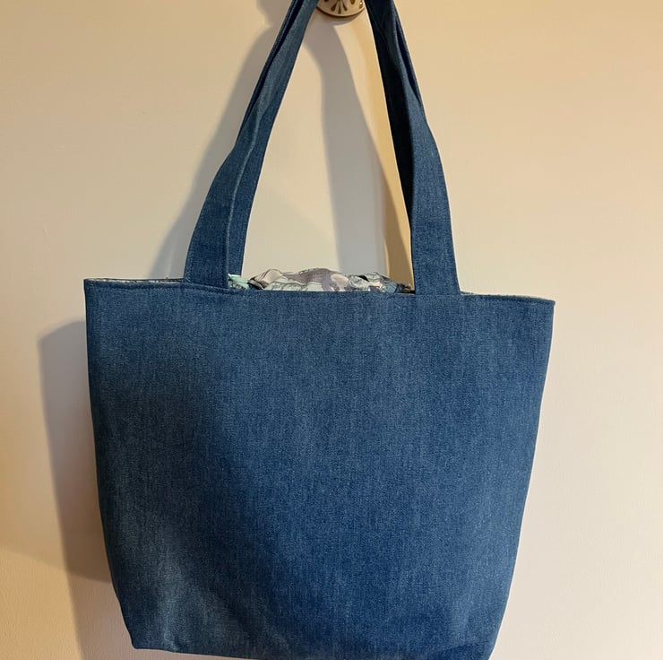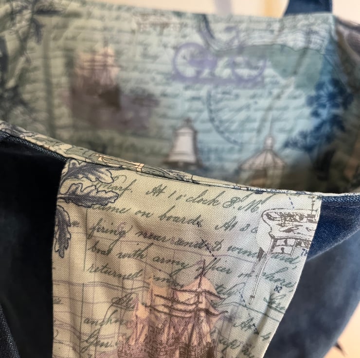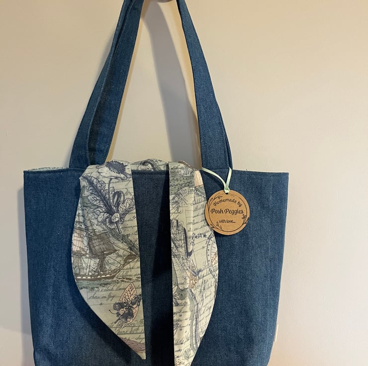 Denim outer bag & handles with cotton printed nautical fabric lining and tie. A light wadding has been added to the main body of the bag to help it keep its shape. 32 cm wide, 27 cm high x 10 cm depth.
