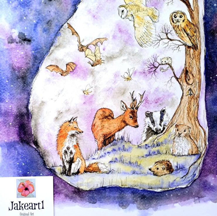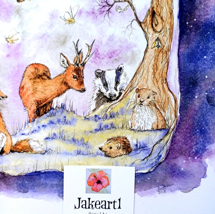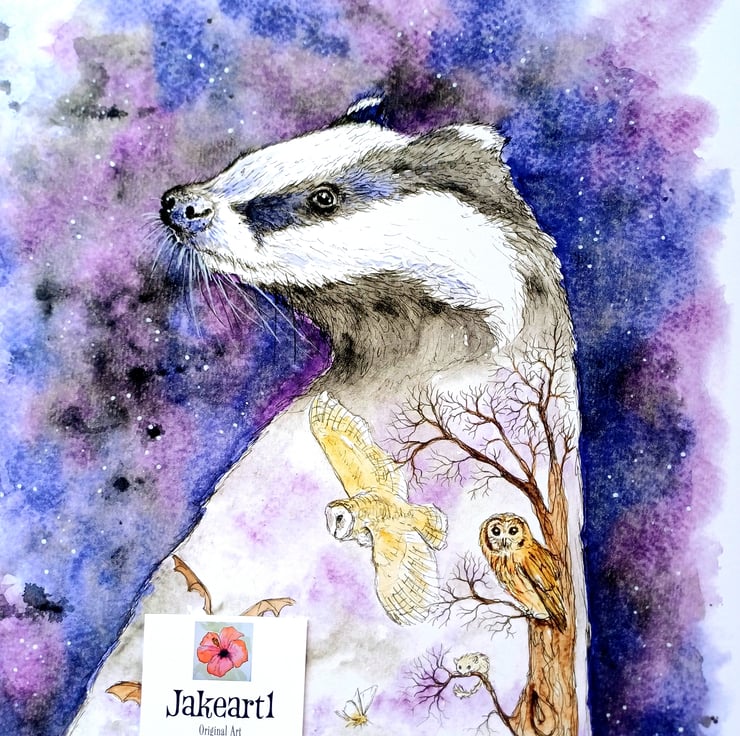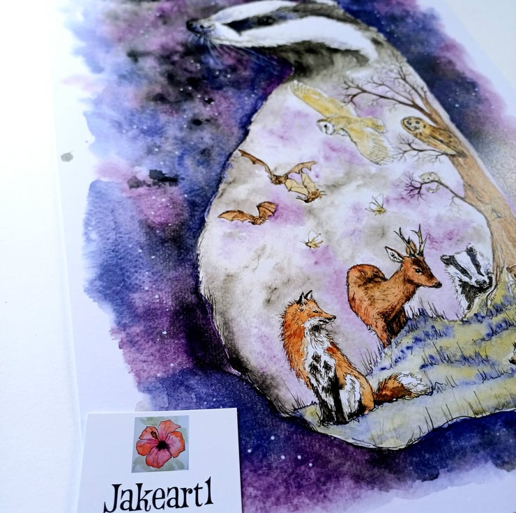 A beautiful badger with a night time woodland scene within. The original illustration was hand drawn by me using fine line pens and painted with watercolours. Fine art prints are on high quality 285gsm card and posted in cellophane within a hardbacked envelope. Giclée prints are made using archival quality inks and faithfully reproduce my unique artwork. A3 (16.5x11.7in) and A2 (23.4x16.5in) are available. Giclée prints come with a certificate of authenticity and are carefully rolled and packed in a sturdy postal tube.