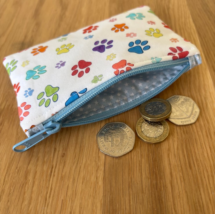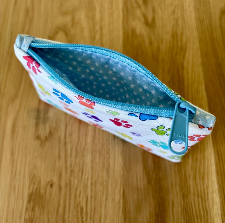 Handmade zipped fabric pouch in white cotton fabric with a fun print of bright paw prints. Perfect for a pet lover!