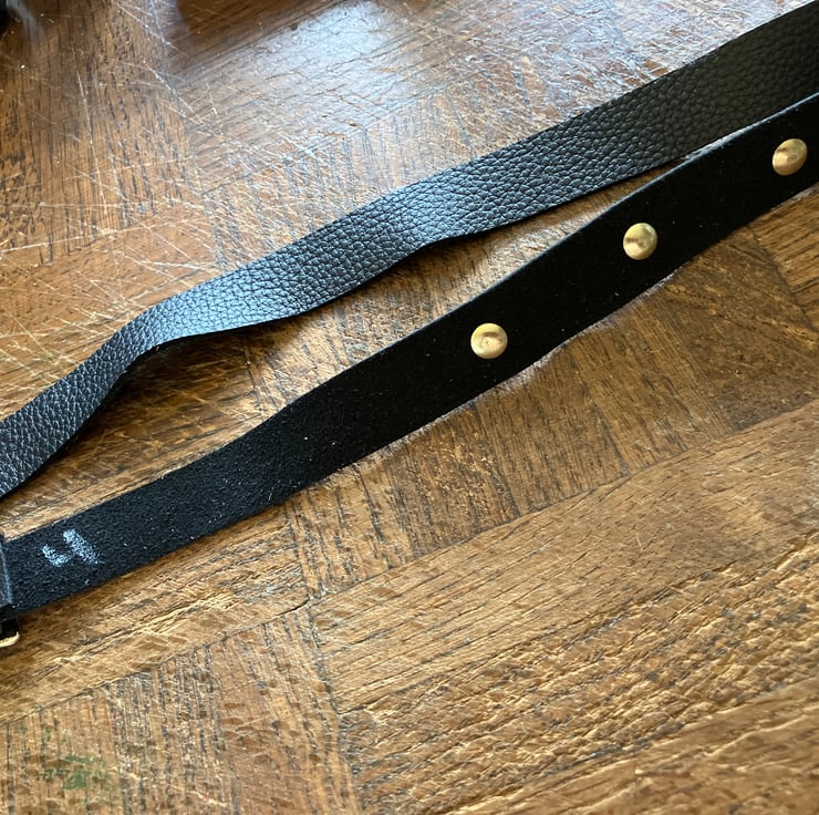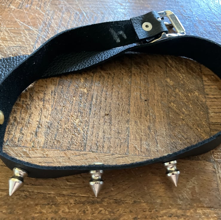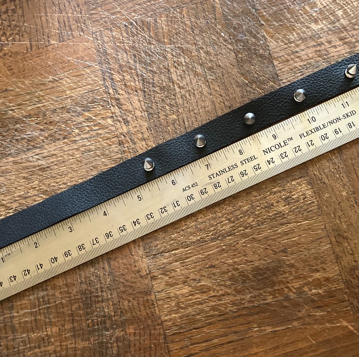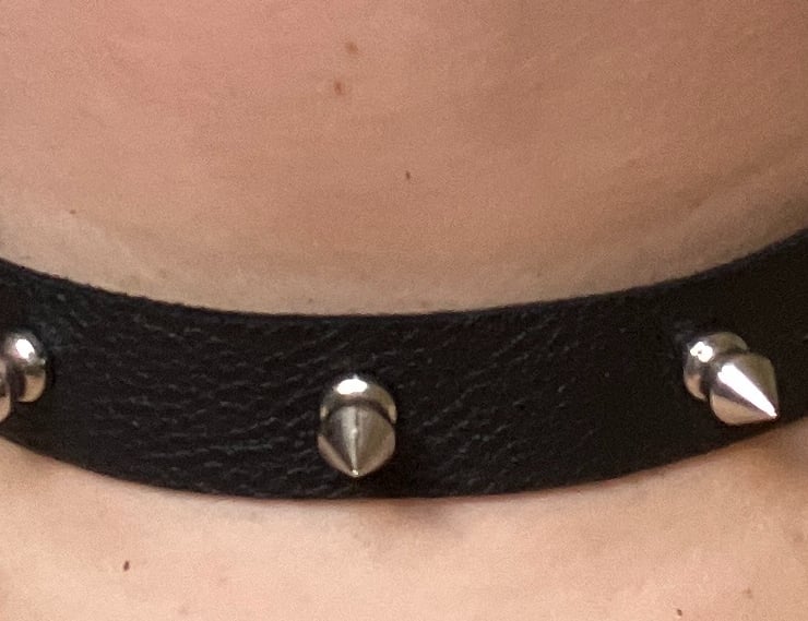 3/4" width -- soft black leather choker with 5 spikes riveted onto the choker. (Last photo shows the backside of the choker so you can be assured the spikes will NOT fall off the choker)