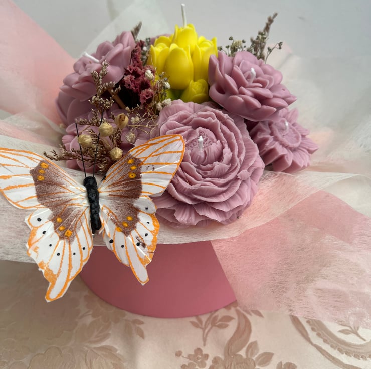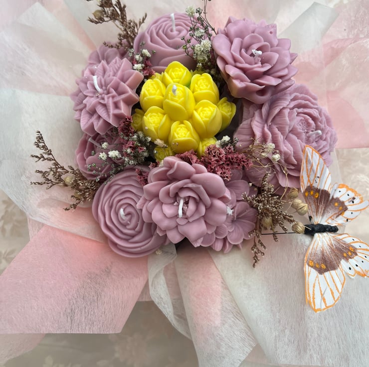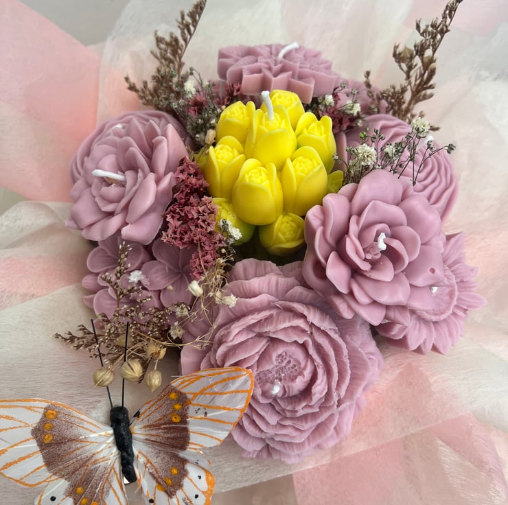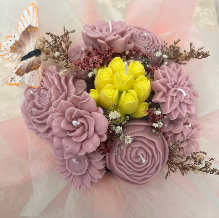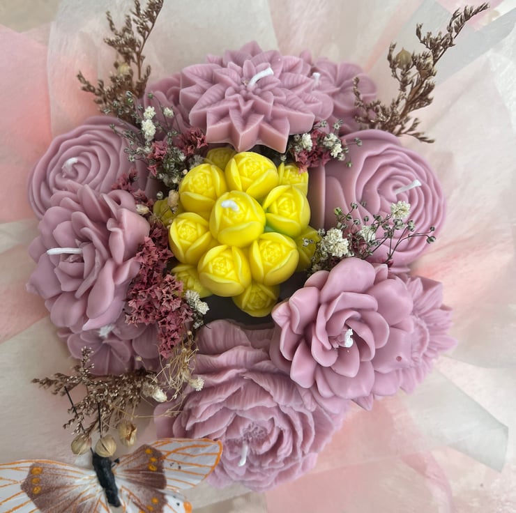Indulge in the soothing aroma of lavender with this handmade soy wax candle arrangement featuring dry flowers and a hint of nature-inspired charm. Perfect for adding a touch of tranquillity to any space, this medium-sized candle is sure to delight your senses with its calming scent and decorative design. The combination of yellow -coloured flowers, scented with lavender, creates a peaceful atmosphere that is ideal for relaxation and creating a cosy home environment. Ideal for those who appreciate artisanal craftsmanship and aromatic ambience