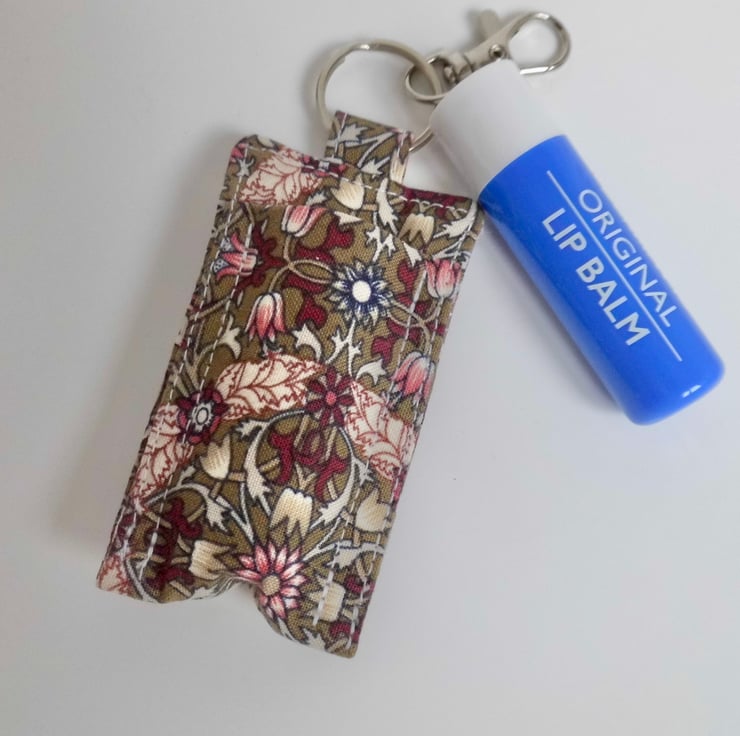 This is a little fabric pouch designed to keep your lip balm stick handily clipped to your bag, purse etc. For this one, I used a quilting cotton printed with William Morris's beautiful Lilies and Roses design. It has a brown background and the stylised flowers are shades of pink.