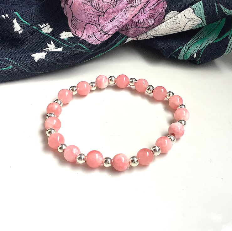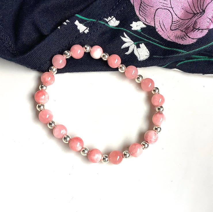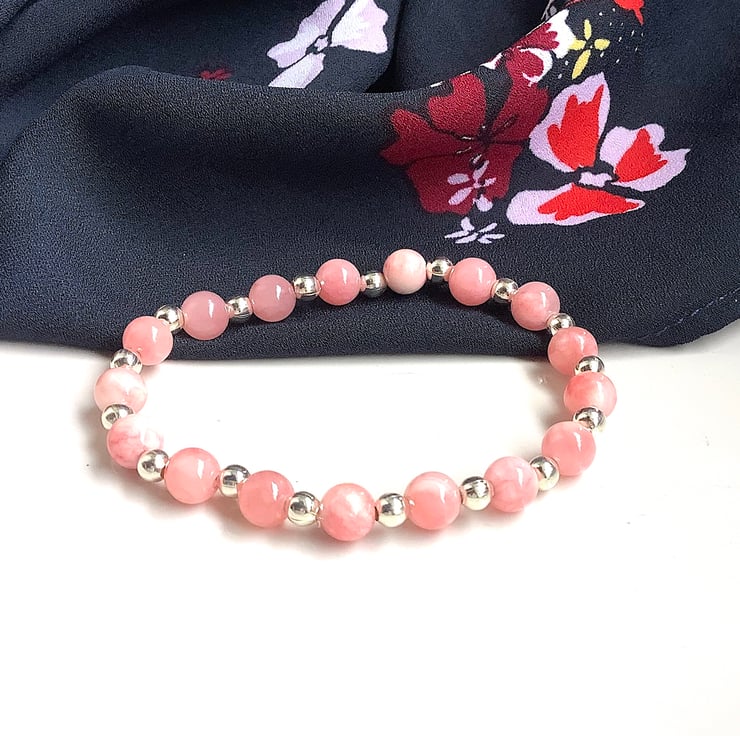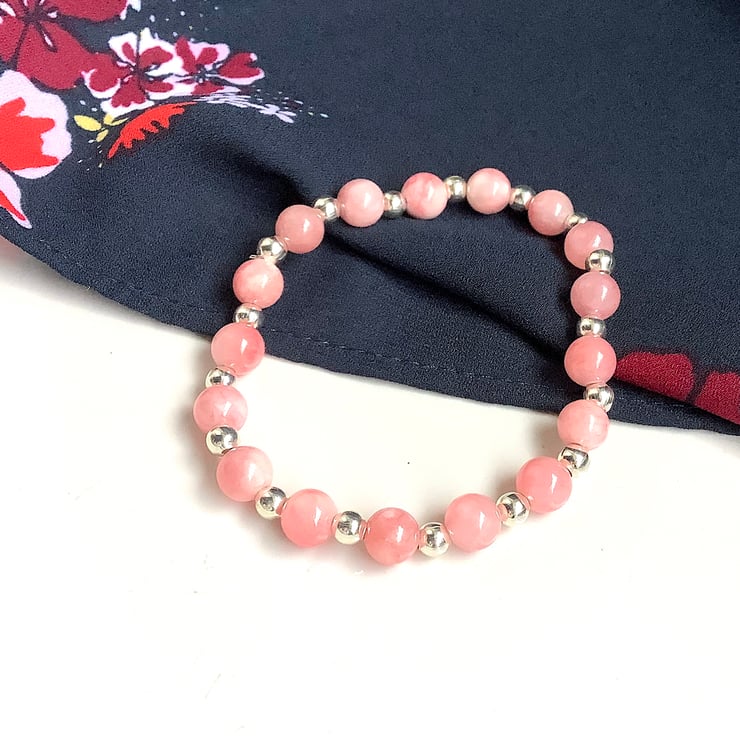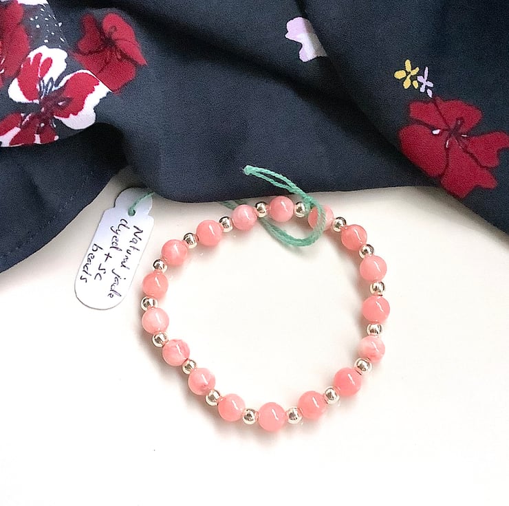 The delicate pink jade with silver colour spacer beads makes a lovely bracelet that goes well with informal and formal clothes.