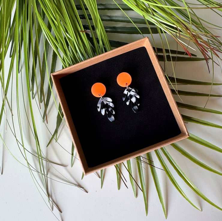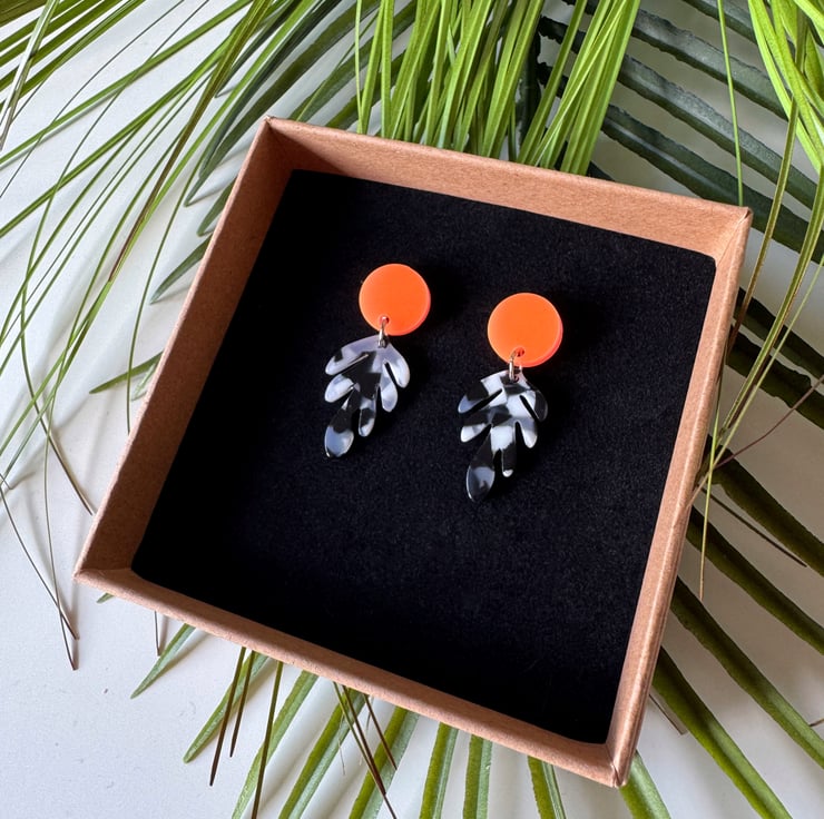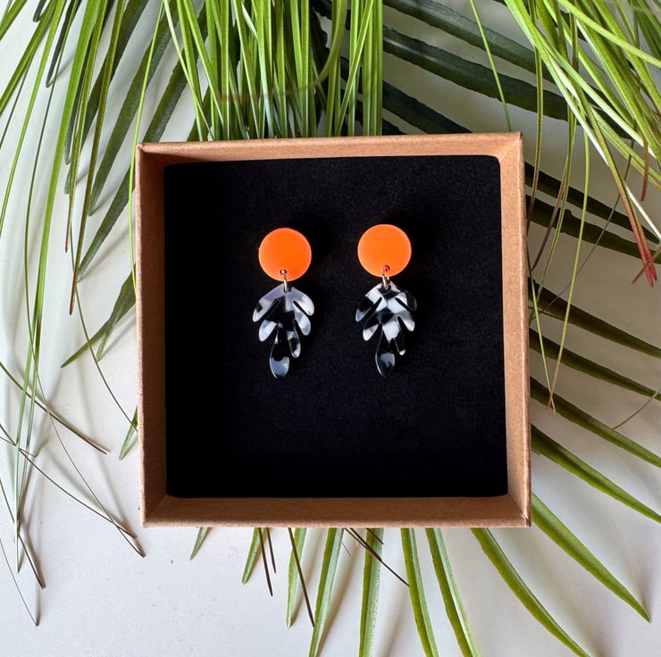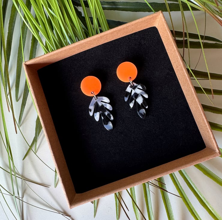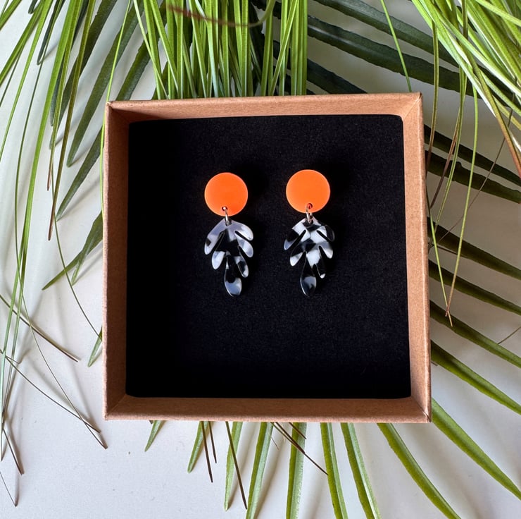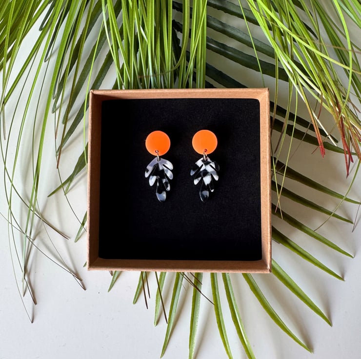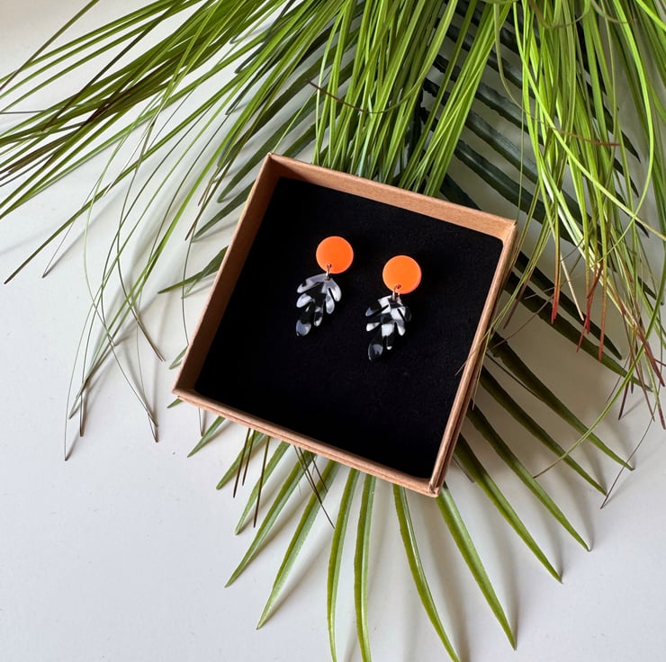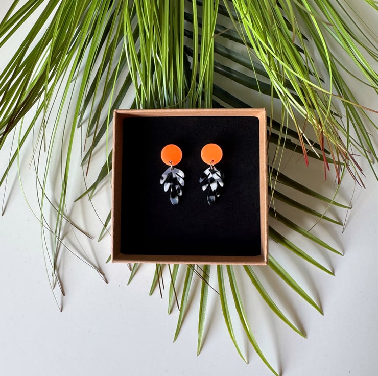 Featuring a striking combination of neon orange circular studs and cascading black-and-white leaf-inspired acrylic dangles.