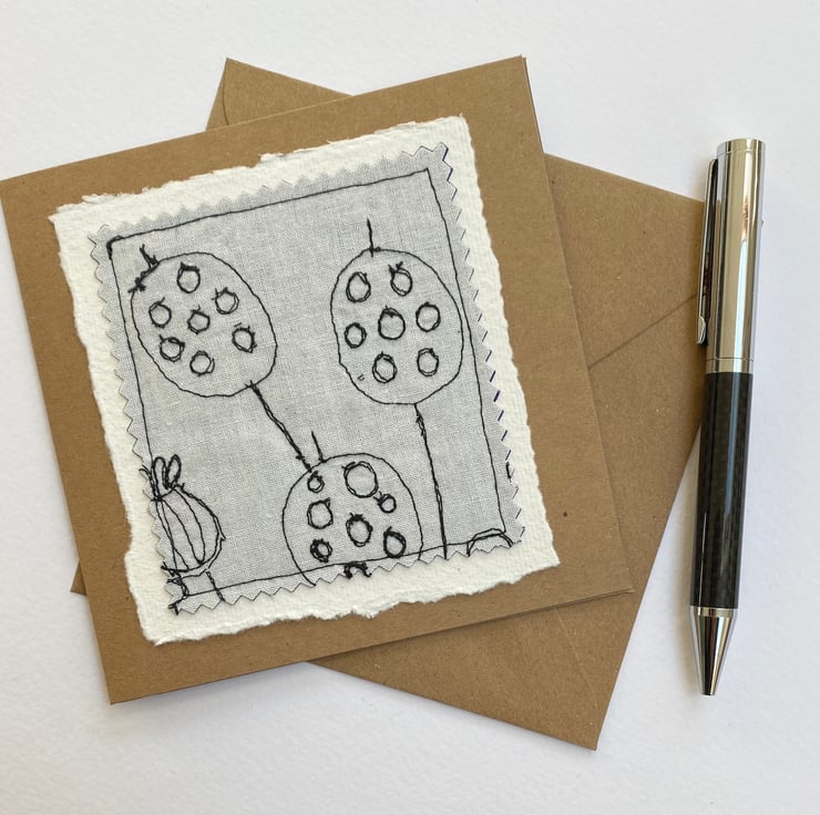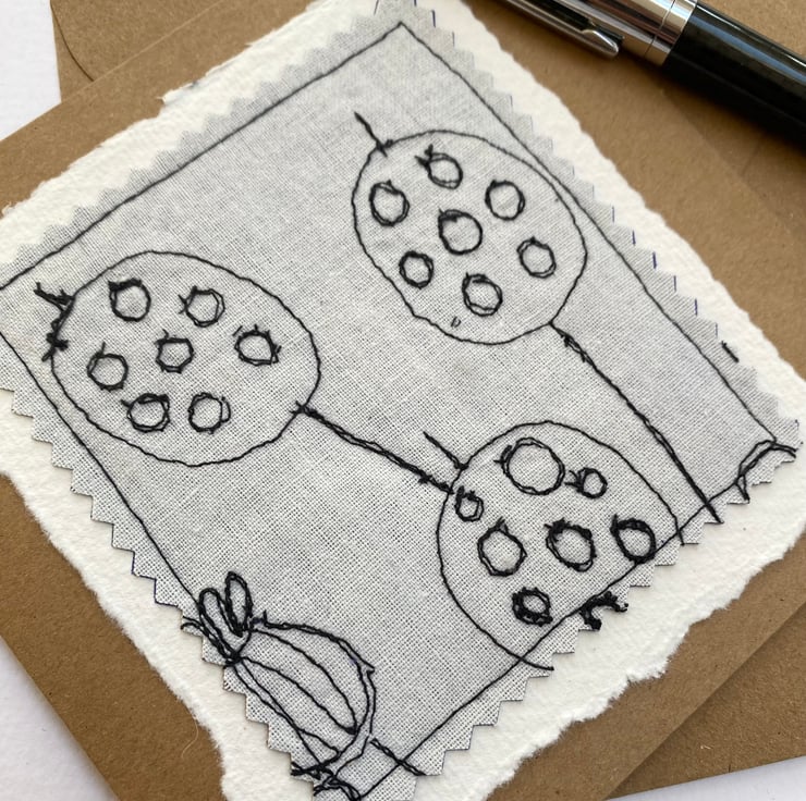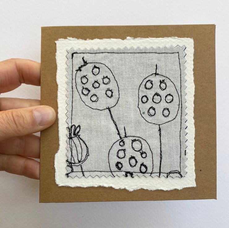This delicate embroidered line drawing of a honesty and poppy seeds garden card has been made with up-cycled fabrics and enhanced with free motion embroidery. It’s perfect for special people and occasions. It is blank inside. This brown card measures 13.5 x 13.5cm, comes with an envelop and in a plastic cover for protection.