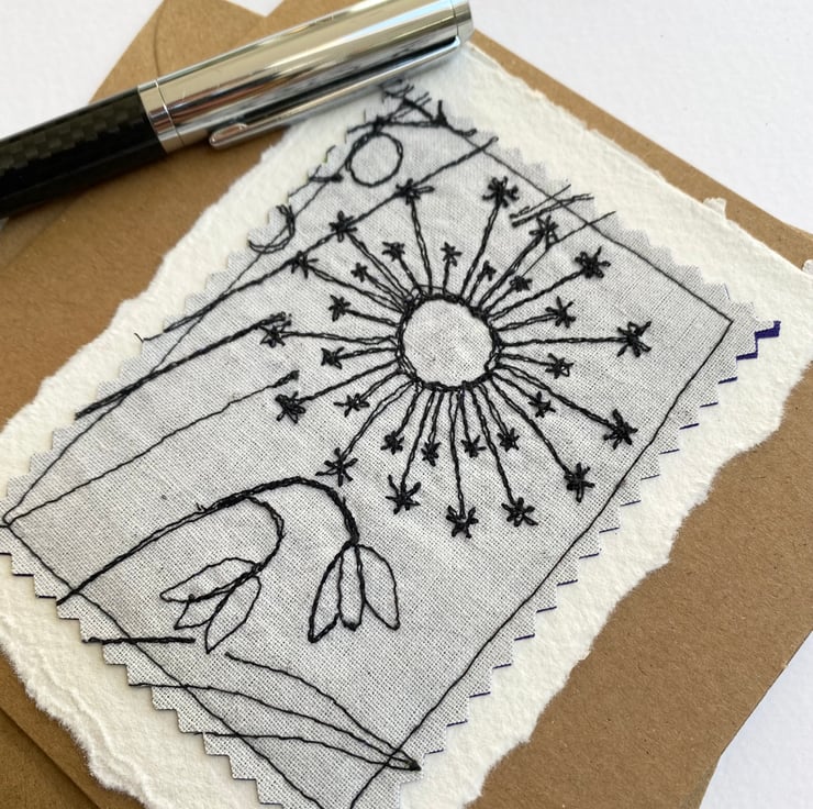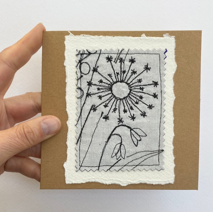 This delicate embroidered line drawing of a dandelion seeds and harebell garden card has been made with up-cycled fabrics and enhanced with free motion embroidery. It’s perfect for special people and occasions. It is blank inside. This brown card measures 13.5 x 13.5cm, comes with an envelop and in a plastic cover for protection.